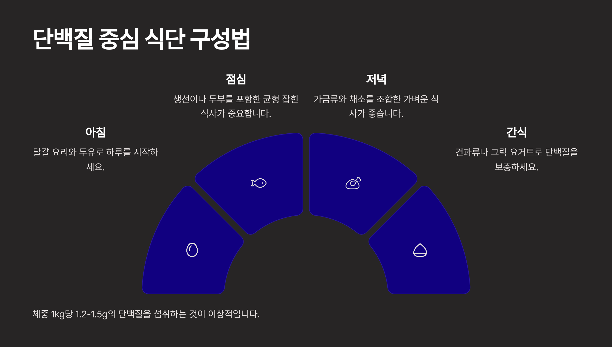 단백질을 매 끼니 골고루 나눠서 먹는 게 핵심이에요. 아침엔 계란이나 두유, 점심엔 닭가슴살이나 생선, 저녁엔 두부나 유제품을 활용해 보세요. 식사에 매번 단백질을 넣는 습관이 체력 회복 속도를 높여줘요. 😋