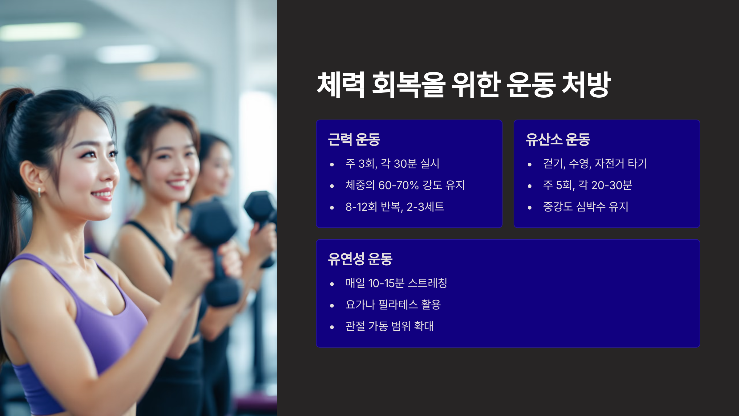 | 근력운동(스쿼트, 아령) | 주 2~3회 | 근육 유지, 체력 증진 |