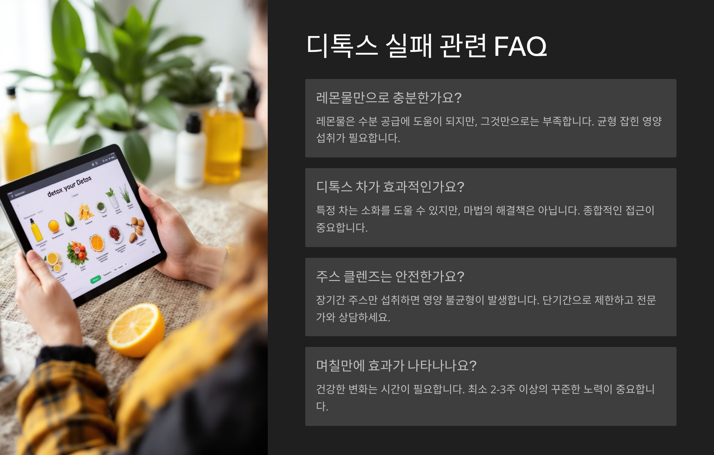 이제 마지막 섹션인 FAQ로 넘어가요! 많은 사람들이 레몬 디톡스를 하며 궁금해했던 질문들을 정리해뒀어요. 바로 이어서 확인해볼까요? ❓❗