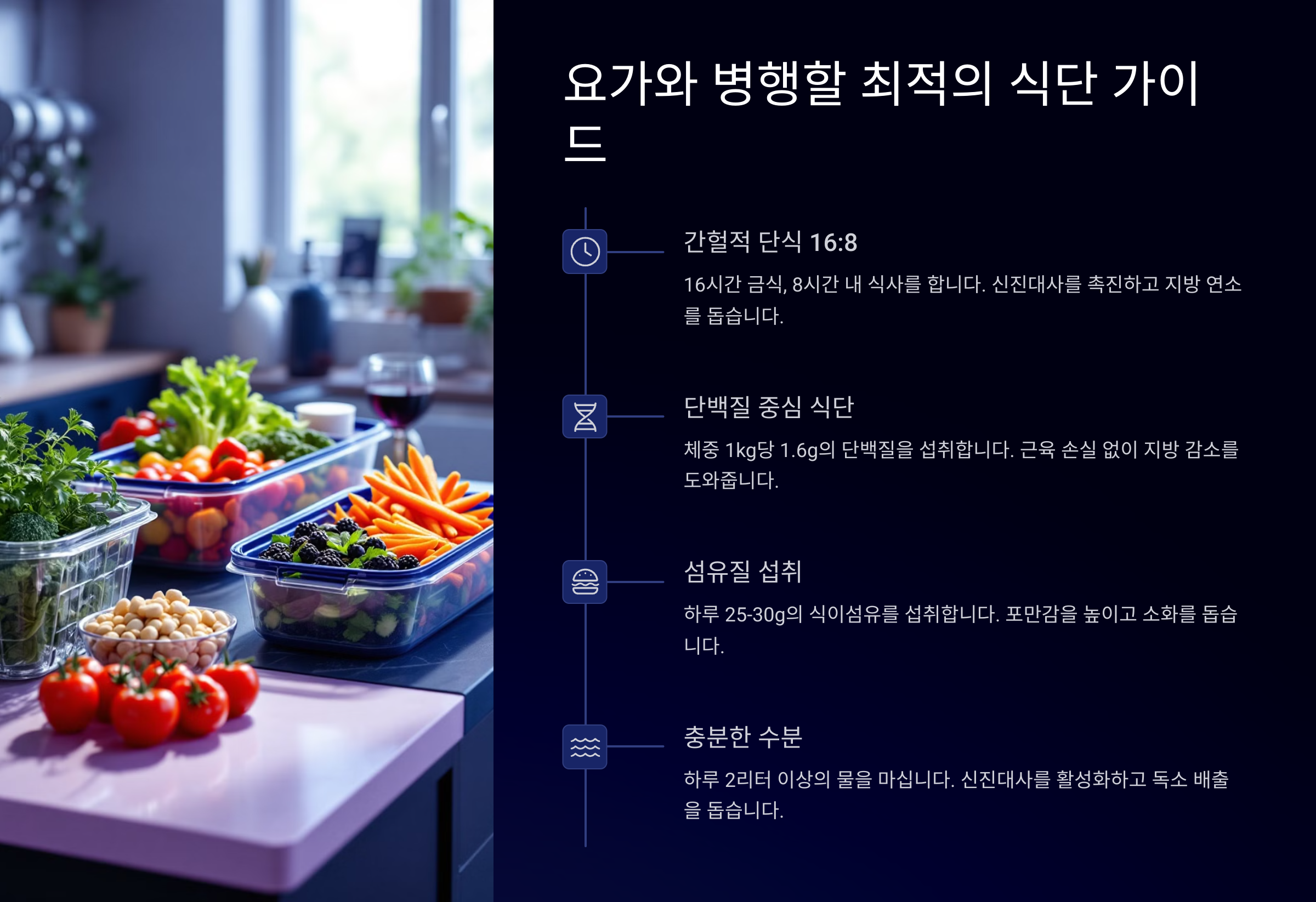 | 단식 방식 | 16:8 간헐적 단식 | 무리한 장기 단식 금지 |