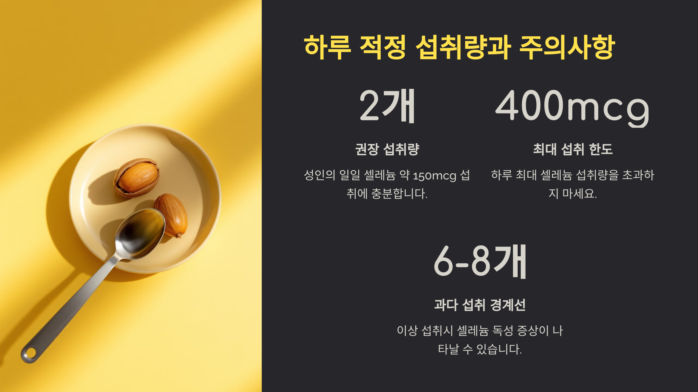 그래서 "브라질너트를 하루 1~2알만 먹는 것"이 가장 안전하고 효과적이라는 말이 나오는 거예요. 😉