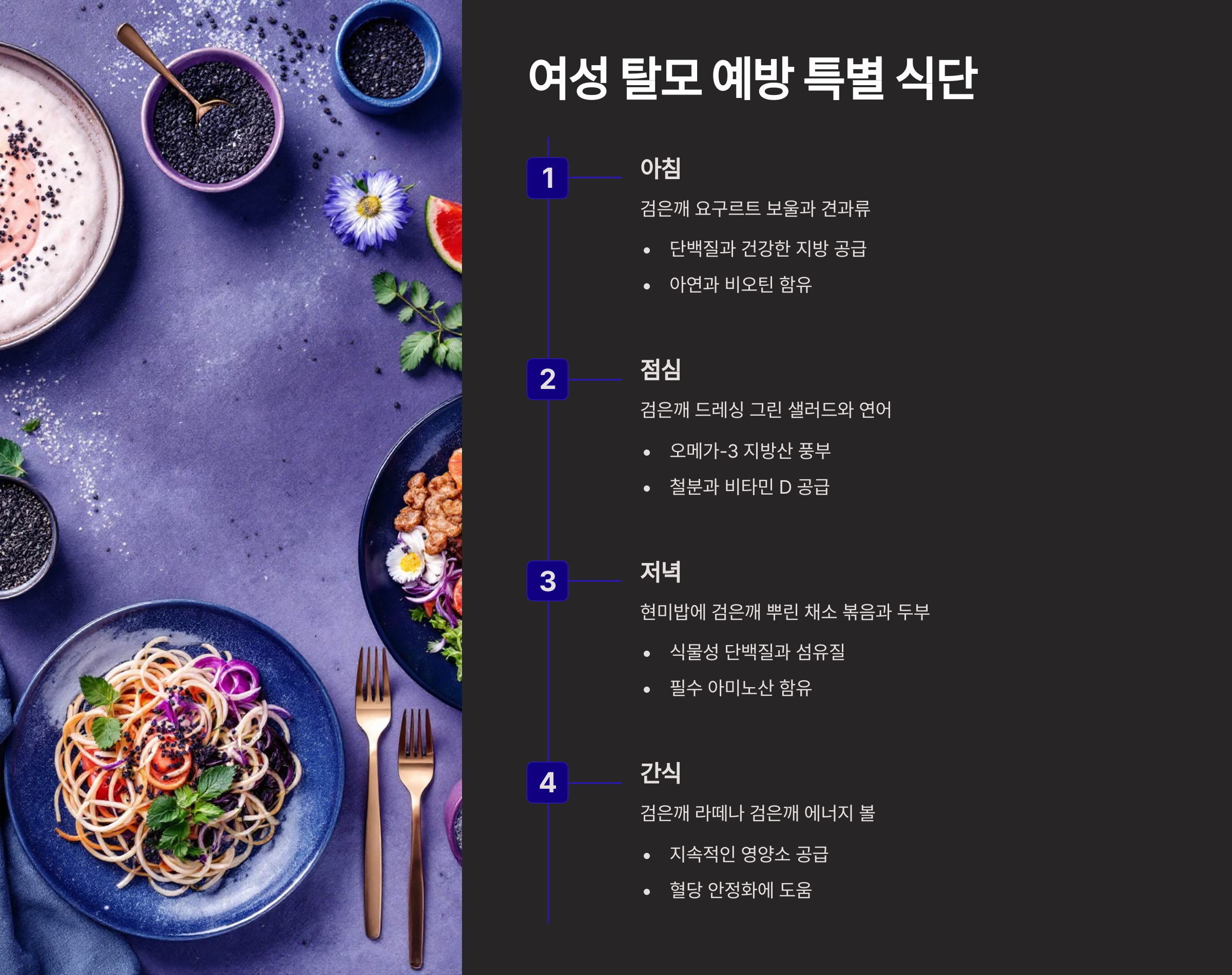 하루 세 끼 식사에 고르게 단백질, 비타민, 미네랄, 필수 지방산을 포함하면 탈모는 물론이고 피부와 전반적인 건강까지 챙길 수 있어요. 여기에 검은깨를 곁들이면 시너지 효과가 생기죠!