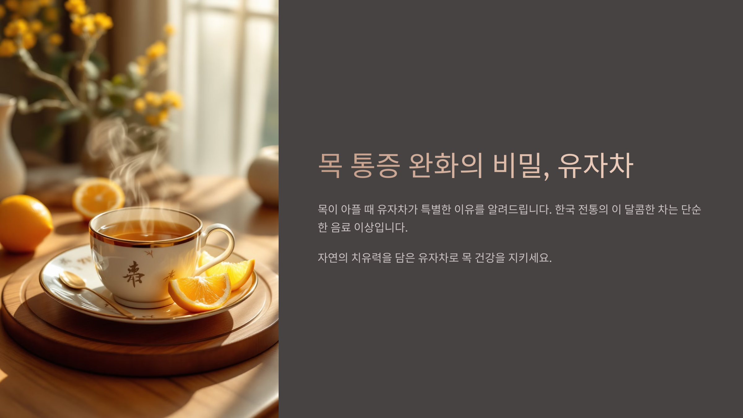 유자차는 겨울철 감기 예방 음료로 많이 알려져 있지만, 목이 아플 때 더욱 빛을 발하는 음료예요. 감기 초기에 따뜻한 유자차 한 잔을 마시면 금세 목이 편안해지는 느낌, 다들 한 번쯤은 느껴봤을 거예요.