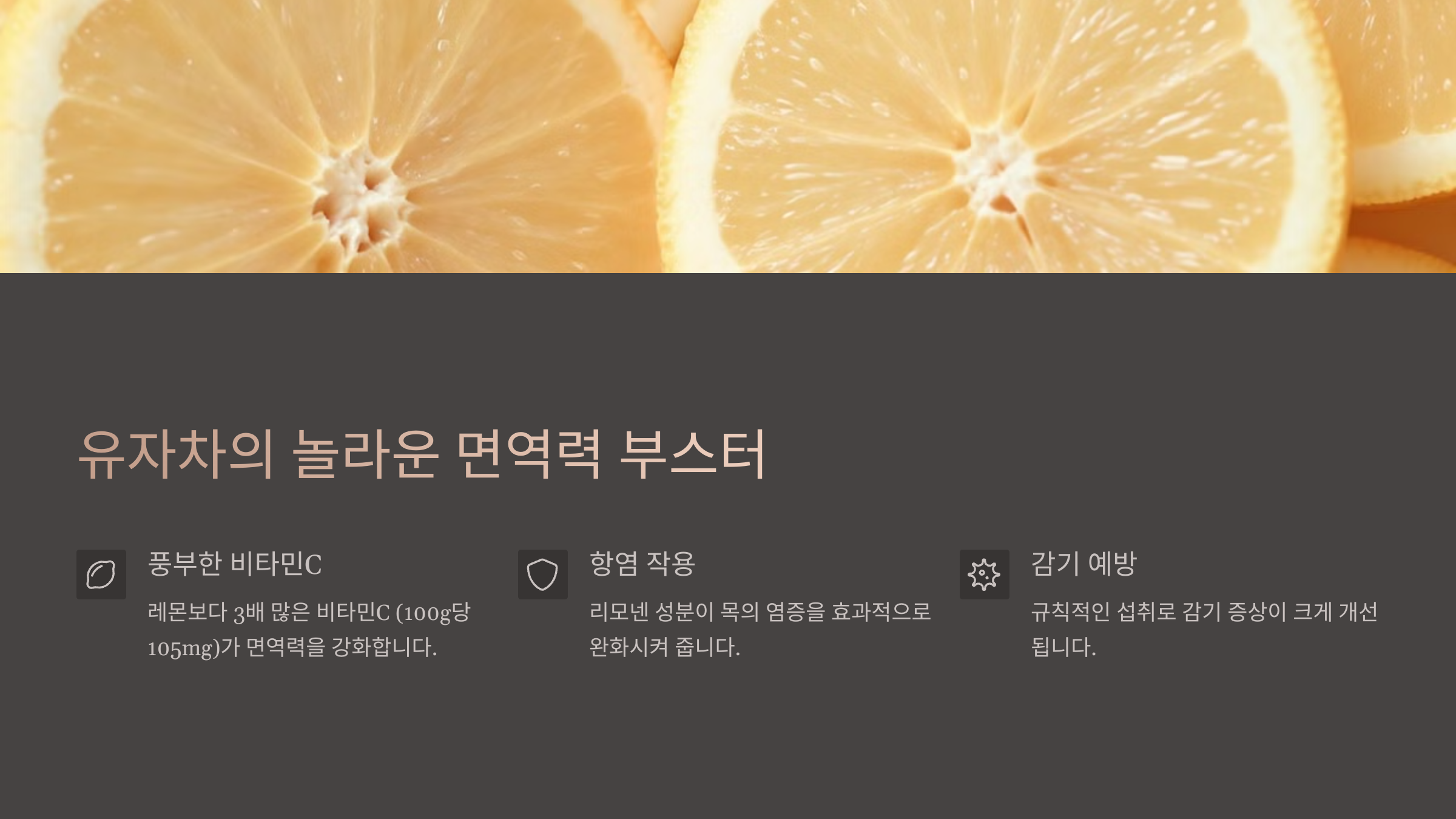 플라보노이드는 몸속에서 항염 작용을 하며, 특히 인후염이나 편도선염처럼 염증이 중심이 되는 목 질환에 효과적으로 작용해요. 또한 유자에는 비타민 C가 레몬보다도 더 많이 들어 있어요. 비타민 C는 면역력 향상과 더불어 염증 억제에도 중요한 역할을 하죠.