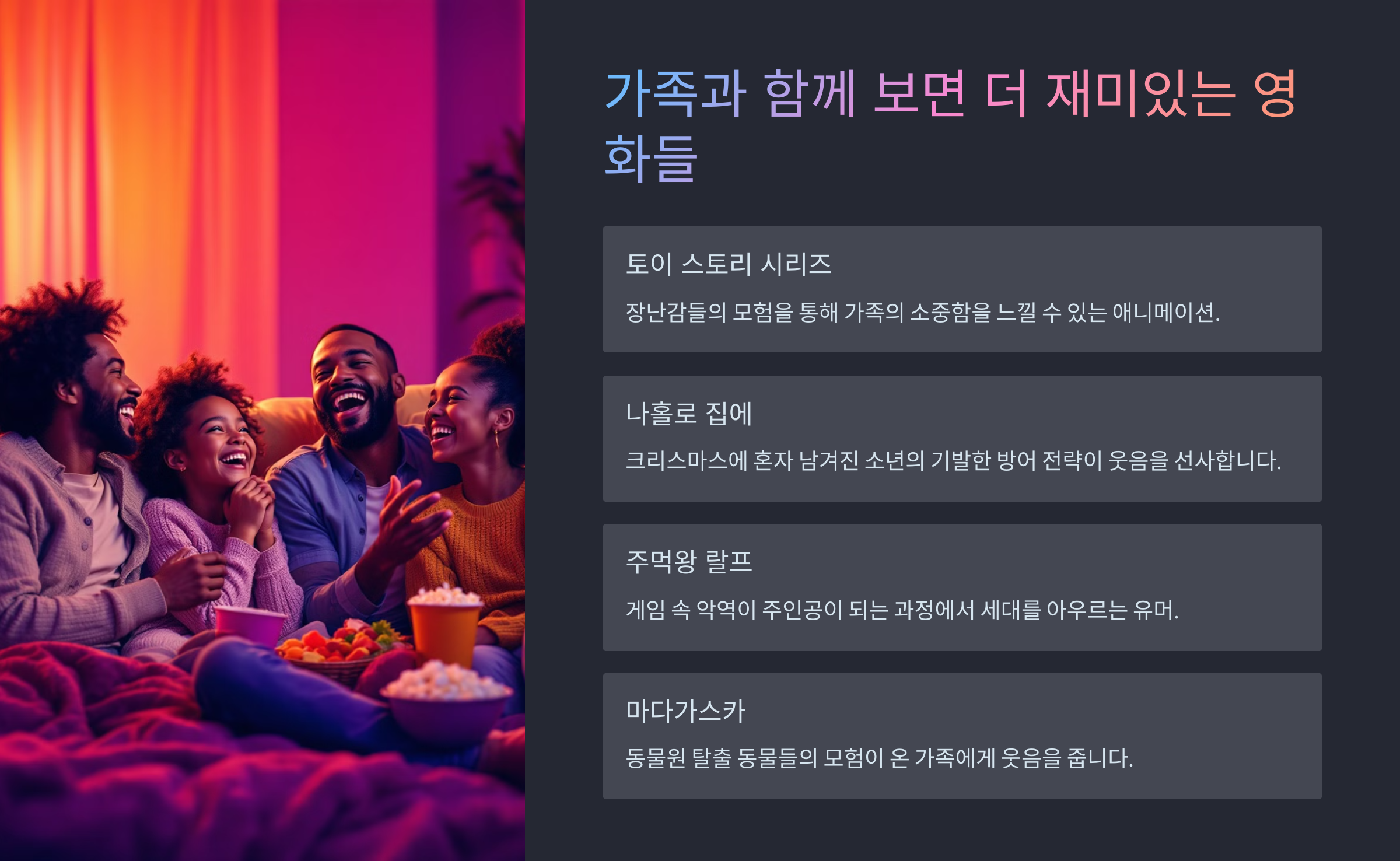 다음 섹션에서는 함께 보면 더 웃긴 가족 코미디 영화들을 소개할게요. 온 가족이 빵 터질 수 있는 작품, 궁금하시죠? 😄