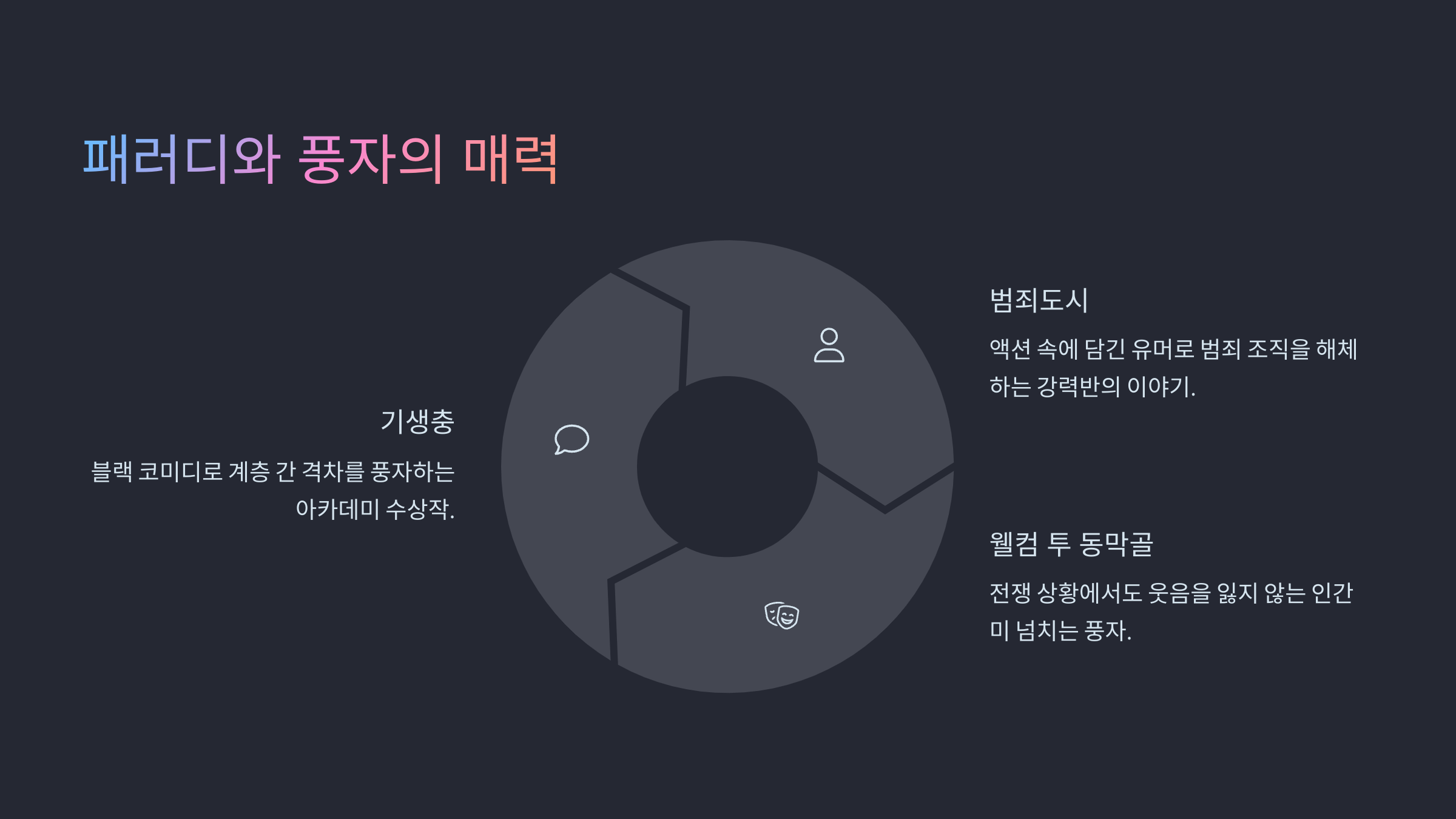 계속해서 다음 섹션에서 또 다른 스타일의 코미디를 소개할게요. 이번엔 풍자와 패러디로 웃음을 유도하는 작품들을 모아봤어요! 😎