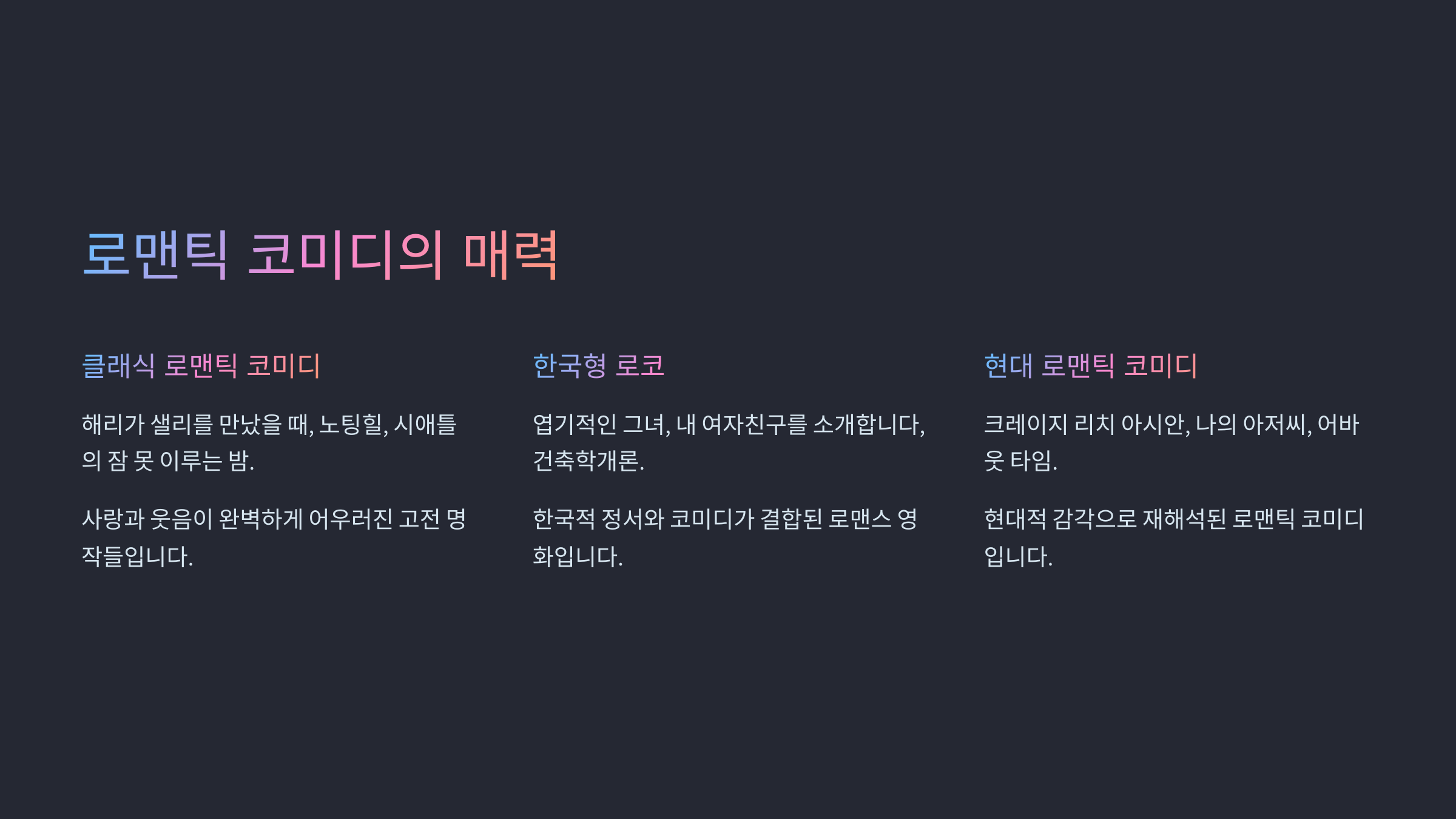 자, 이제는 감성도 살짝 얹어진 유쾌한 로맨틱 코미디들로 넘어가 볼까요? 사랑과 웃음, 두 마리 토끼를 잡고 싶다면 다음 섹션을 주목해 주세요 💘