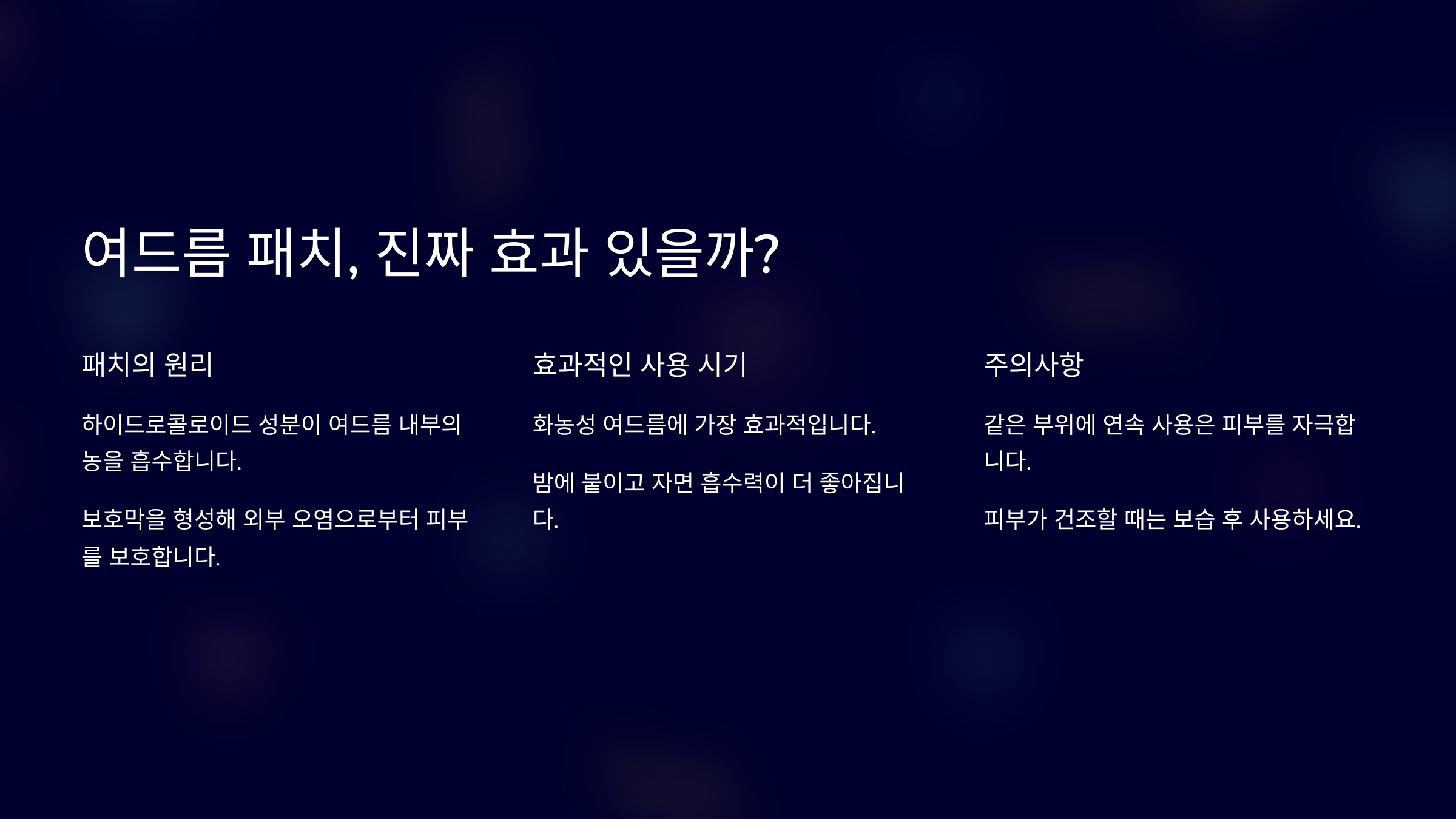 | 살리실산 패치 | 살리실산 | 각질 제거 및 피지 감소 | 붉은 여드름 예방 |