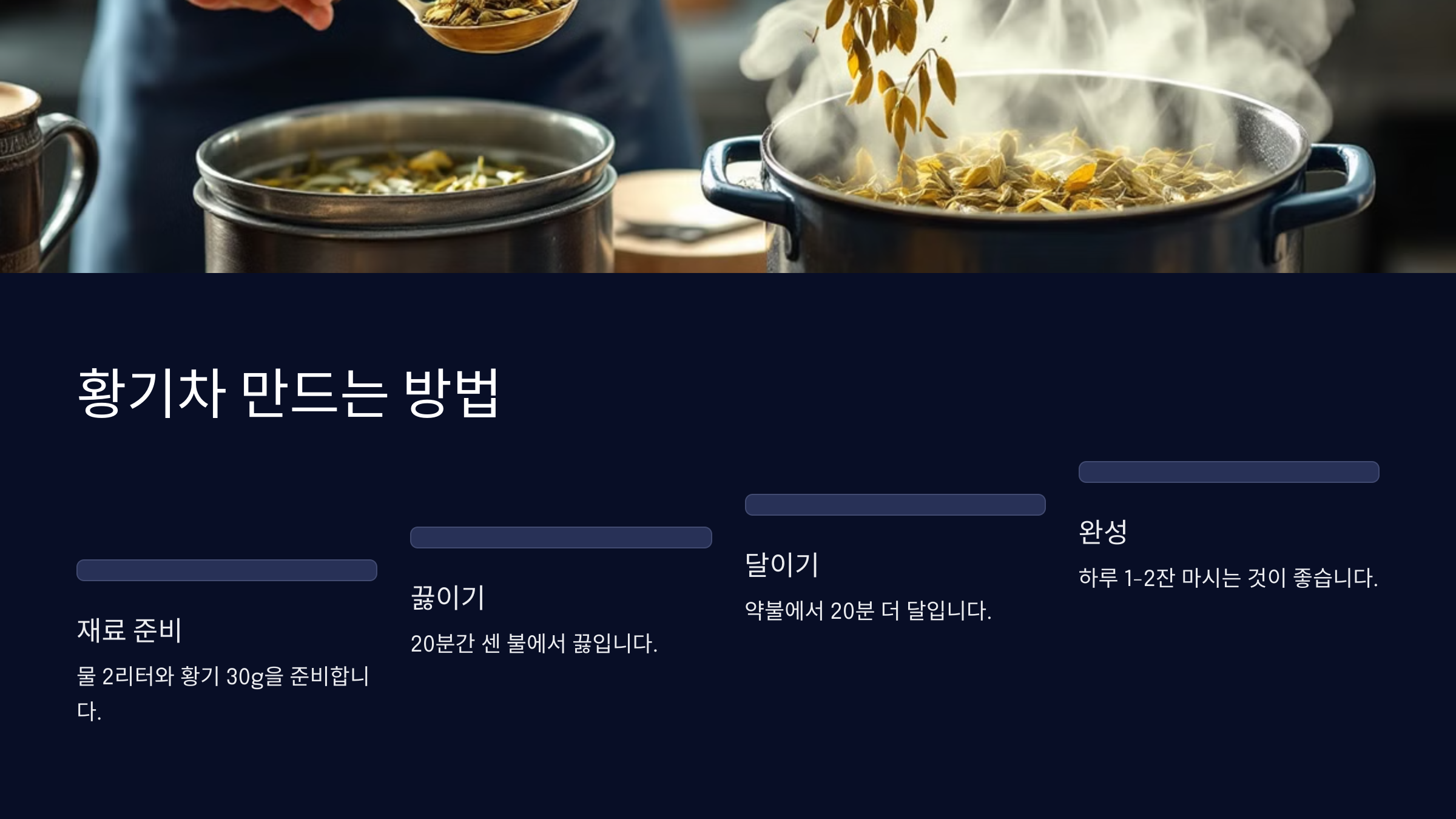 황기차를 끓일 땐 보통 황기 뿌리 30g에 물 1리터 정도를 넣고 30분 이상 끓이면 진하게 우러나요. 물이 줄어들수록 맛도 진해지기 때문에, 원하는 진한 정도에 따라 끓이는 시간을 조절하면 돼요.