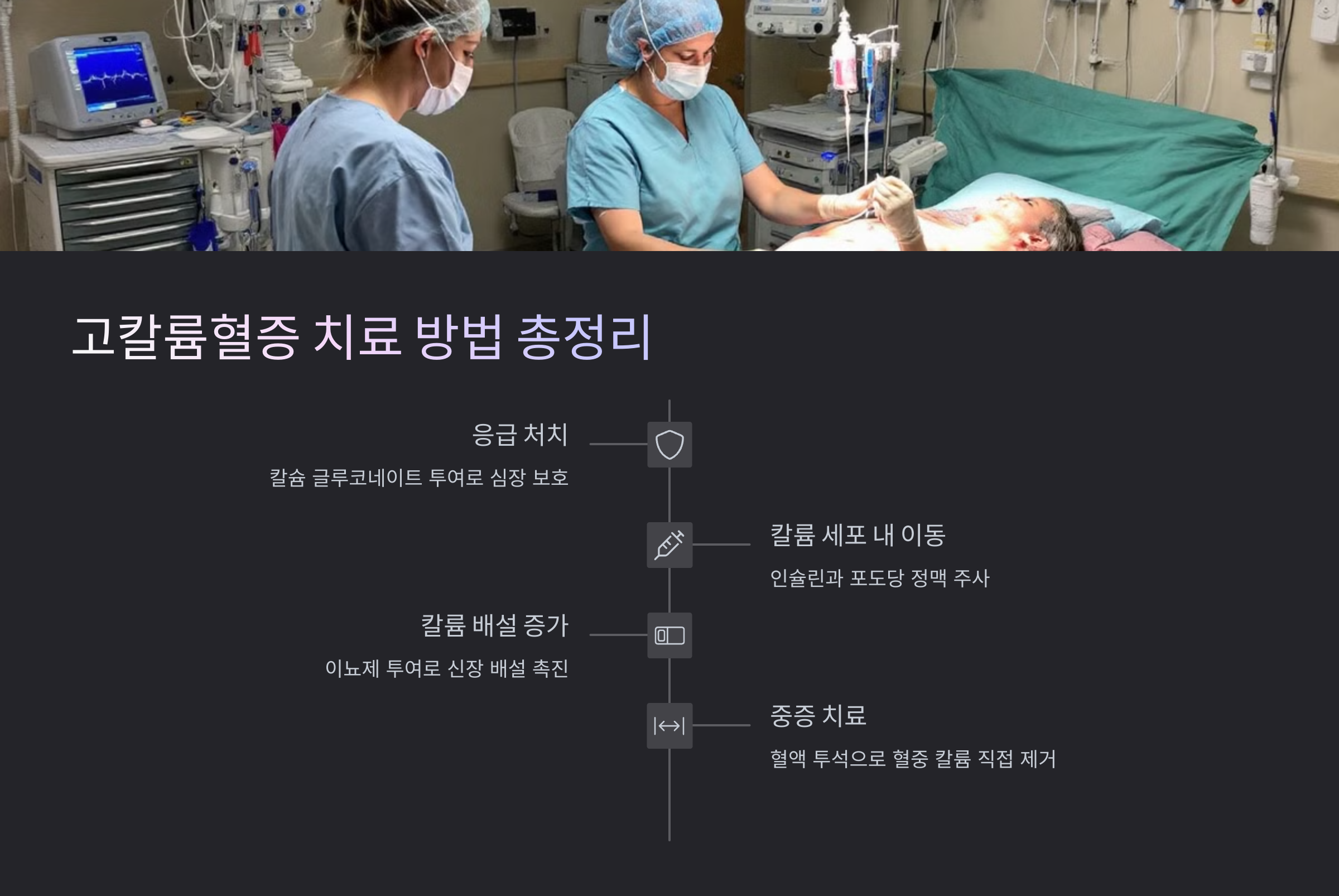 | ⚡ 응급 투석 | 신부전 환자의 경우 투석을 통해 신속하게 혈중 칼륨을 제거할 수 있어요. |