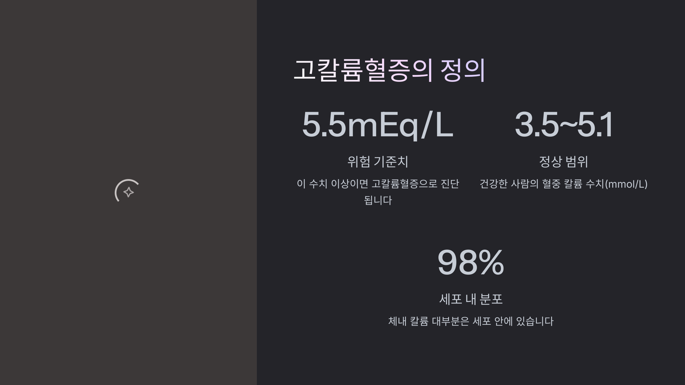 고칼륨혈증(Hyperkalemia)은 혈액 속 칼륨(K⁺) 농도가 비정상적으로 증가한 상태를 의미해요. 정상적인 혈중 칼륨 농도는 3.5~5.0mmol/L인데, 5.0mmol/L를 넘으면 고칼륨혈증으로 진단돼요. 특히, 6.5mmol/L 이상이면 심각한 수준으로 심장 박동 이상, 근육 마비 등 위험한 증상이 나타날 수 있어요. 🏥
