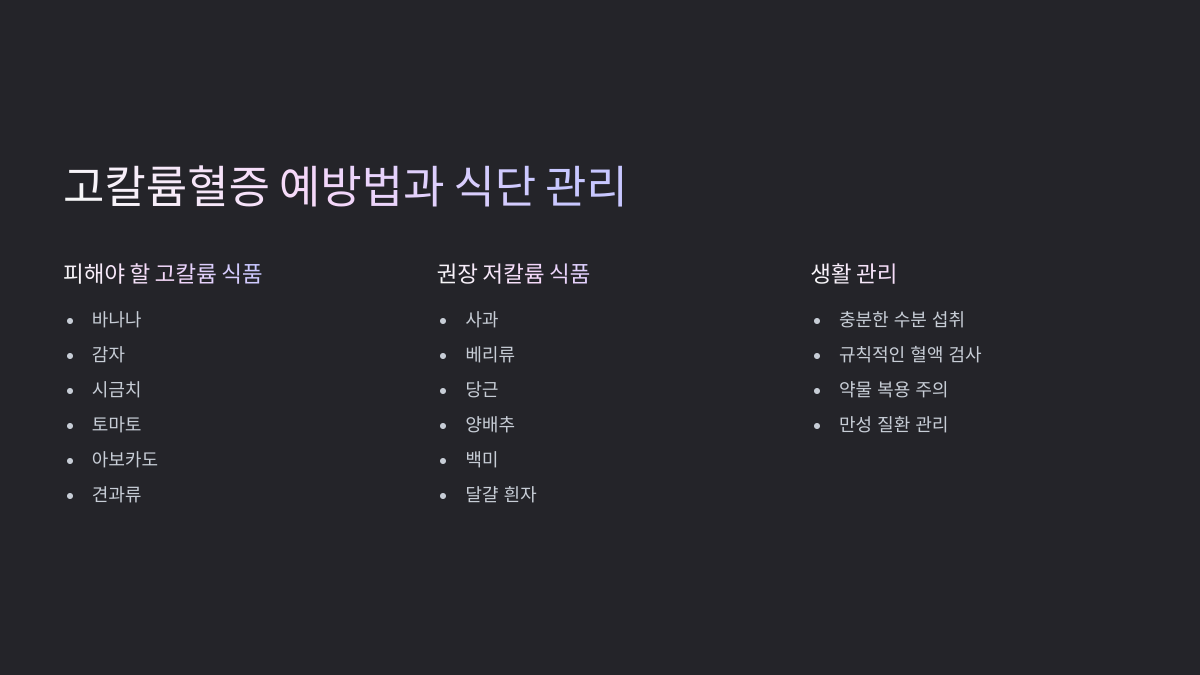 A8. 저칼륨 식단, 충분한 수분 섭취, 정기적인 혈액 검사, 신장 건강 관리가 핵심이에요. 특히 신장 질환이 있는 분들은 전문의와 상담하는 것이 중요해요. 👩⚕️