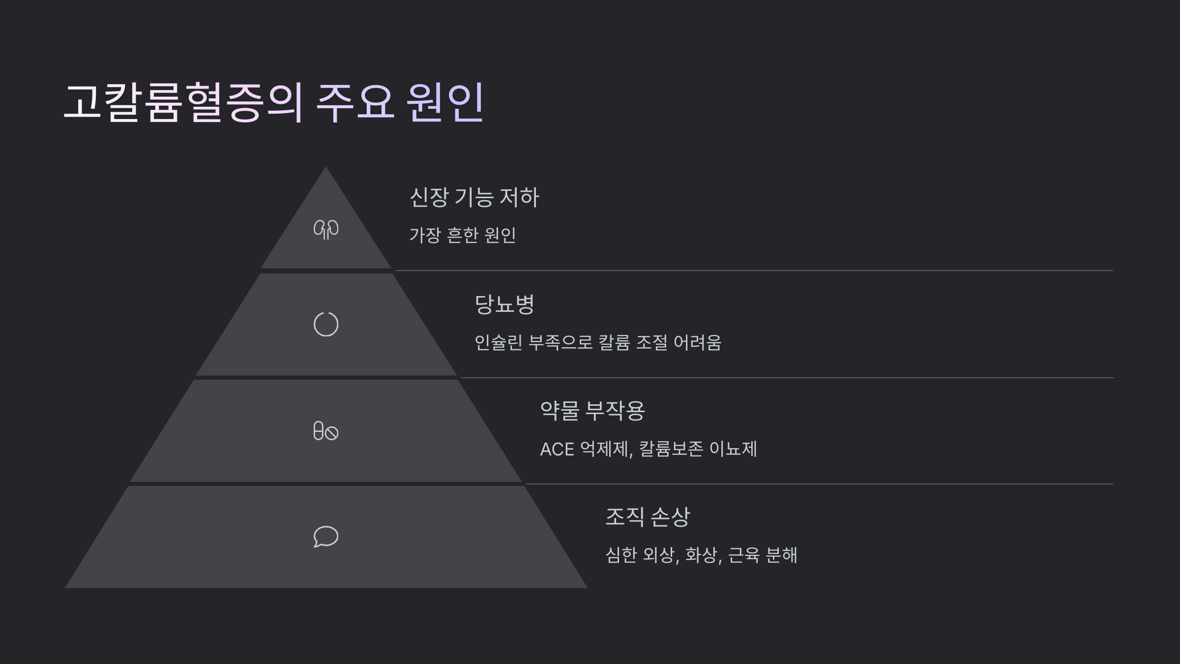내가 생각했을 때, 고칼륨혈증은 단순히 칼륨을 많이 먹는다고 생기는 게 아니라 신체 내에서 칼륨을 처리하는 기능이 문제를 일으킬 때 더 위험한 것 같아요. 특히 신장 질환이 있거나 특정 약물을 복용 중이라면 정기적인 검사로 칼륨 수치를 확인하는 게 중요해요. 📊