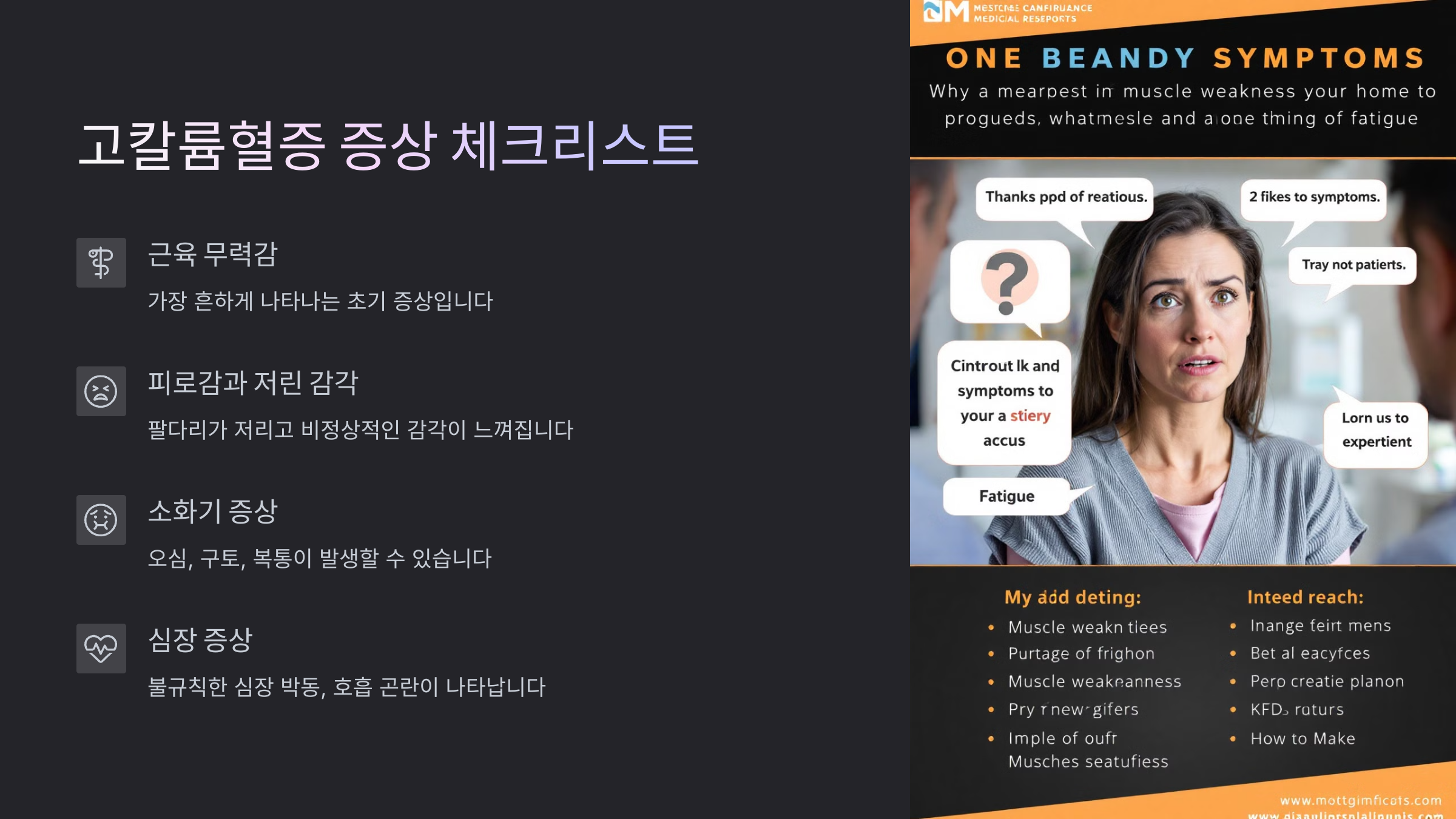 고칼륨혈증은 초기에 별다른 증상이 없을 수도 있지만, 칼륨 수치가 높아지면 다양한 신체 이상이 나타날 수 있어요. 특히 심장, 신경, 근육에 영향을 주기 때문에 주의가 필요해요! 🏥