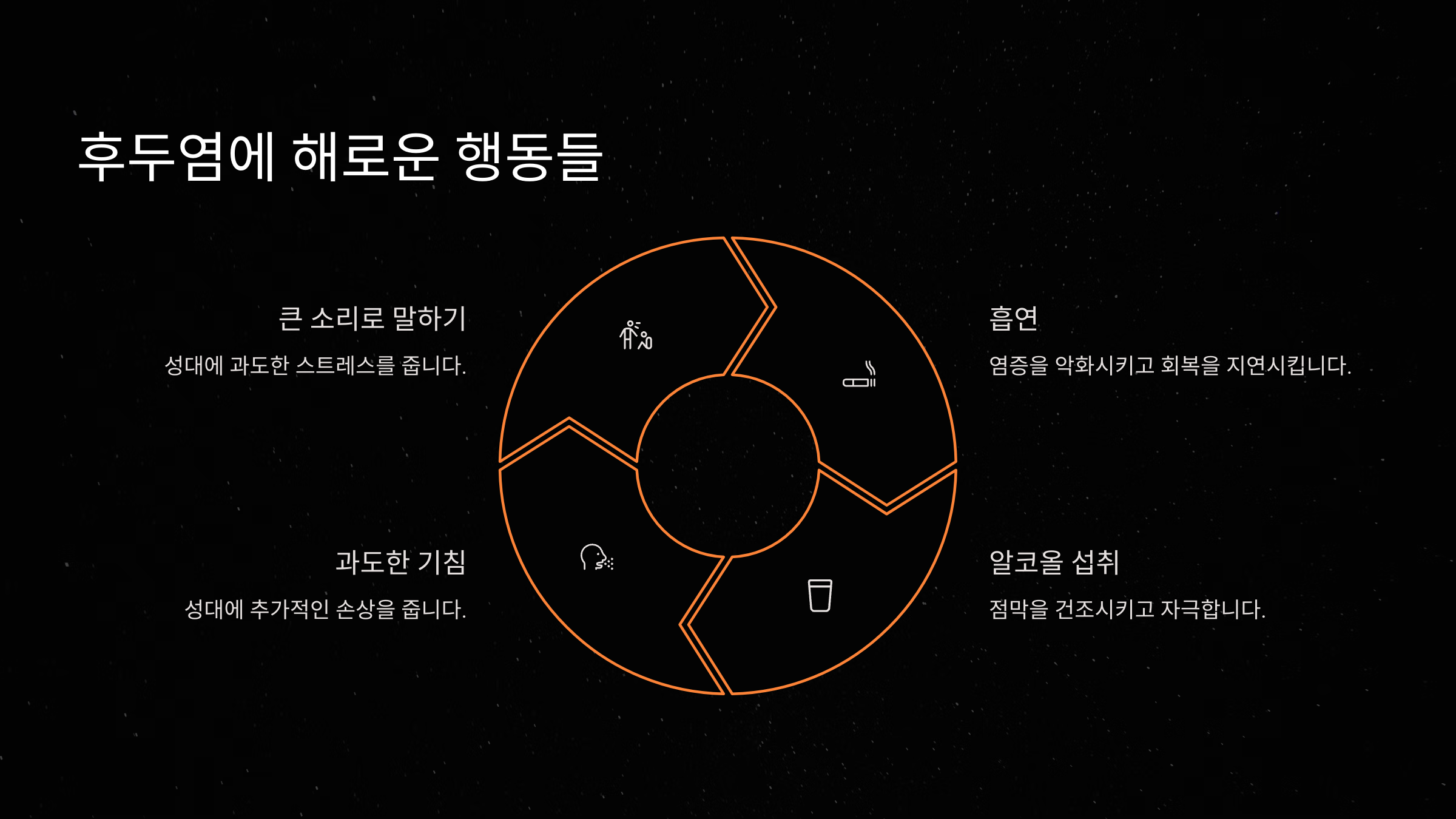혹시 위의 습관 중 하나라도 해당된다면, 지금이라도 당장 멈추는 게 좋아요. 후두염 회복에 방해만 될 뿐이에요.