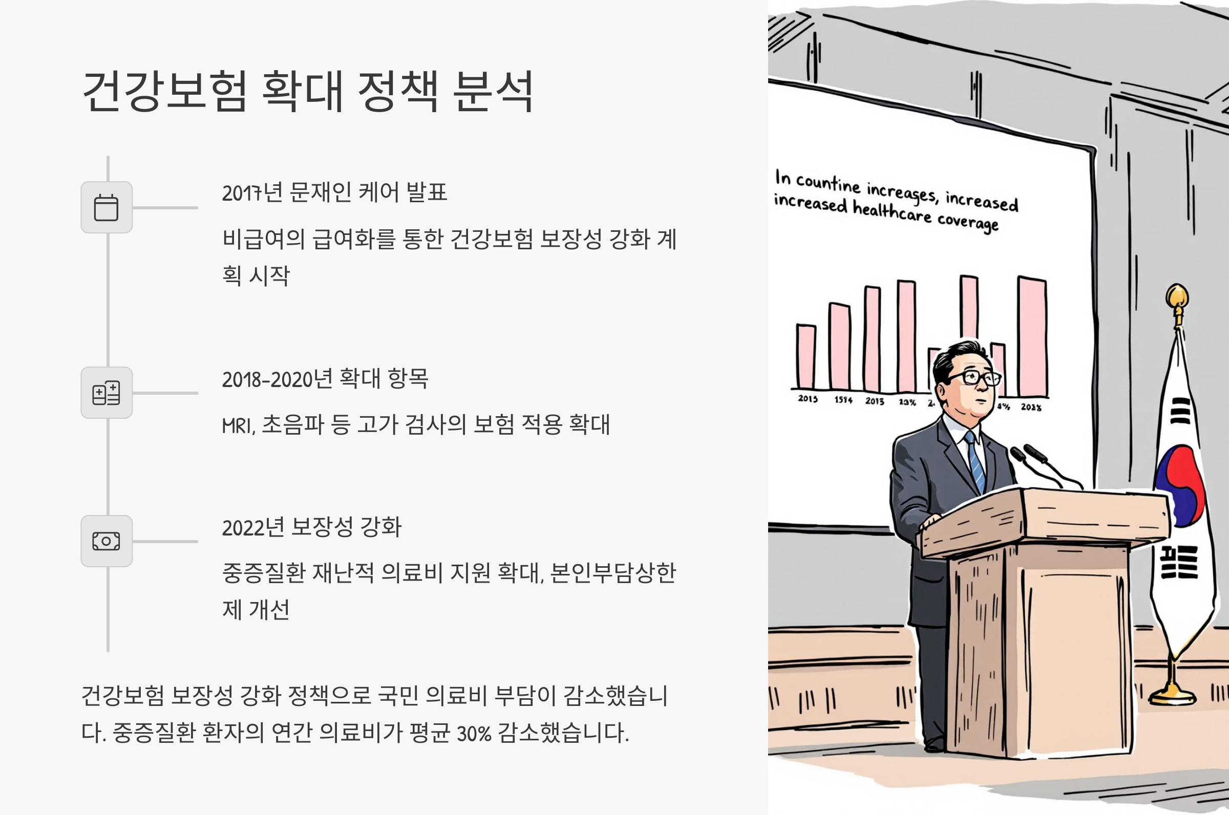 현재, 건강보험은 점점 더 많은 영역으로 보장 범위를 넓혀가고 있어요. 정부는 '건강보험 보장성 강화대책', 일명 '문재인 케어' 이후로 의료비 부담을 줄이는 방향으로 정책을 추진하고 있어요. 여기엔 고가 진료의 보험 적용 확대, 취약계층 보호, 비급여 항목의 단계적 급여화 등이 포함돼요.