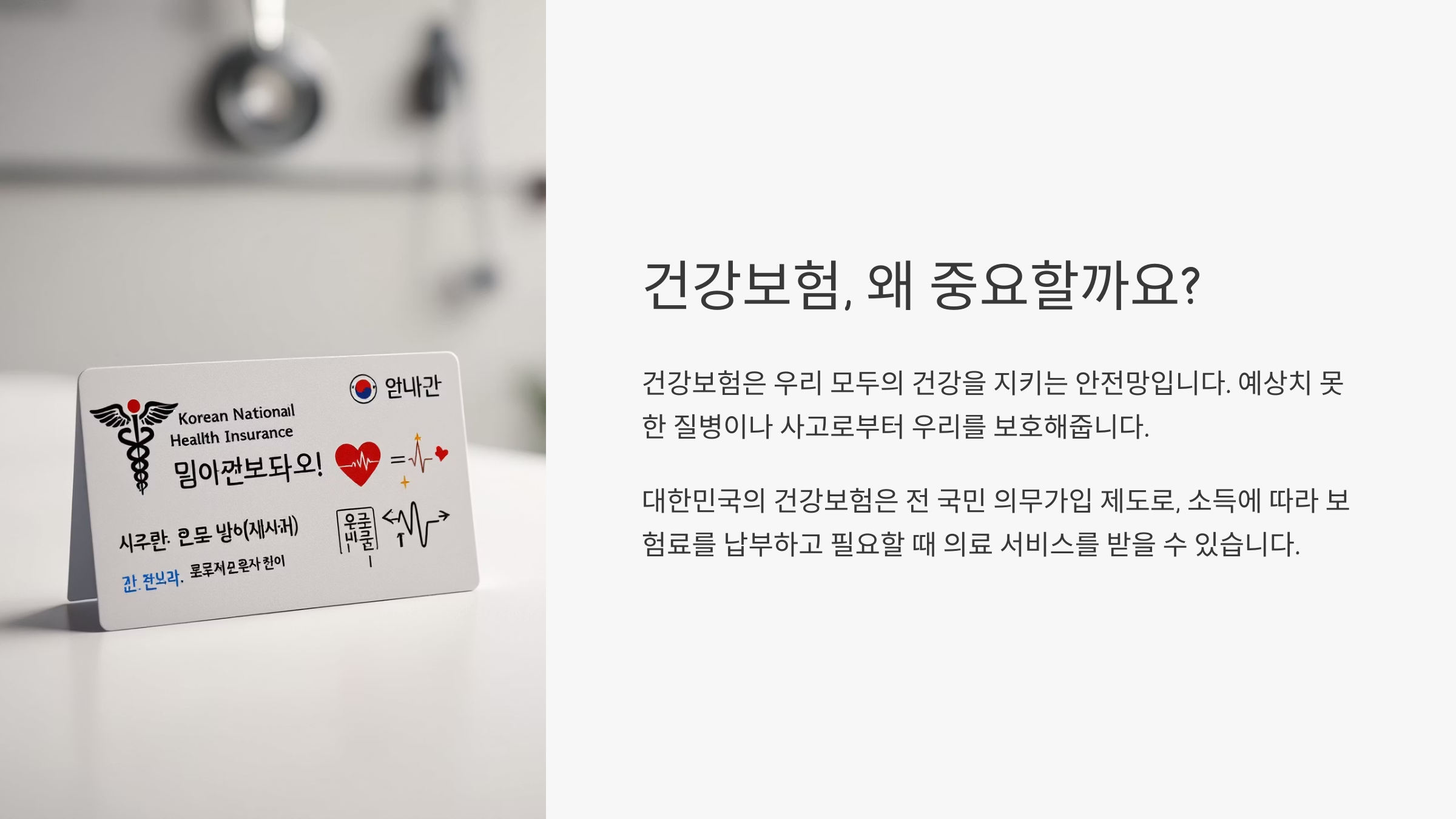 이처럼 건강보험은 '있으면 좋다'의 개념이 아니라, '없으면 위험하다'에 가까운 제도예요. 조금씩 내는 보험료로 큰 사고나 질병에 대비할 수 있다면, 정말 훌륭한 사회적 안전망이 아닐 수 없어요.