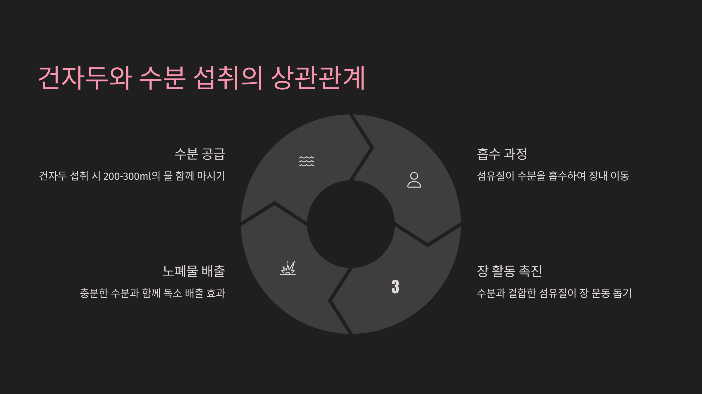 건자두 속 식이섬유는 수분을 흡수하면서 팽창하는 성질이 있어요. 물을 함께 마시면 그 섬유질이 장에서 볼륨을 형성하면서 연동운동을 도와줘요. 변이 부드러워지고, 배출도 훨씬 쉬워지죠. 그래서 물 없이 먹으면 오히려 장이 건조해지고 복통을 유발할 수 있어요.