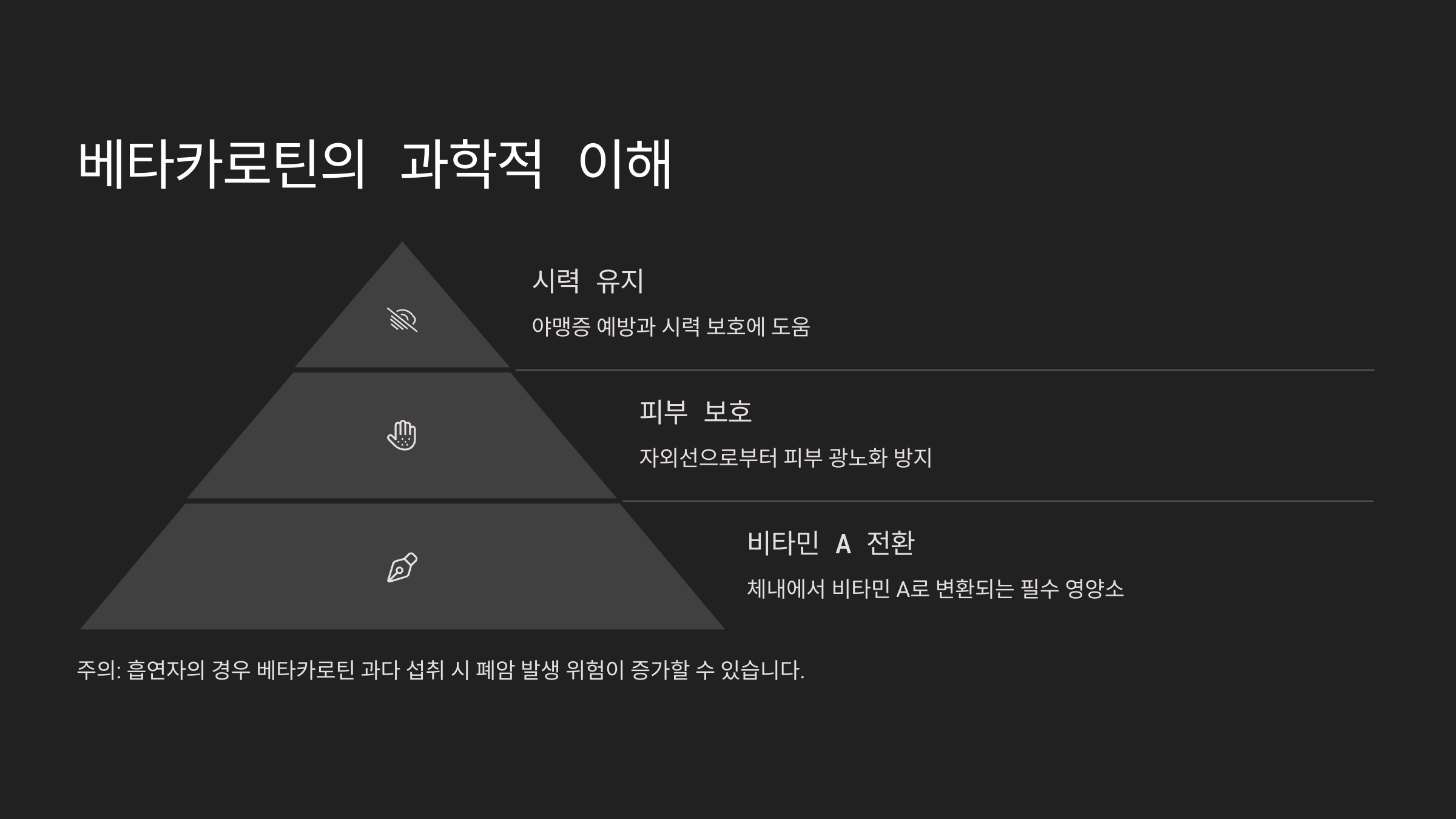 | 베타카로틴 | 항산화, 시력 보호 | 비타민 A 전구체 |