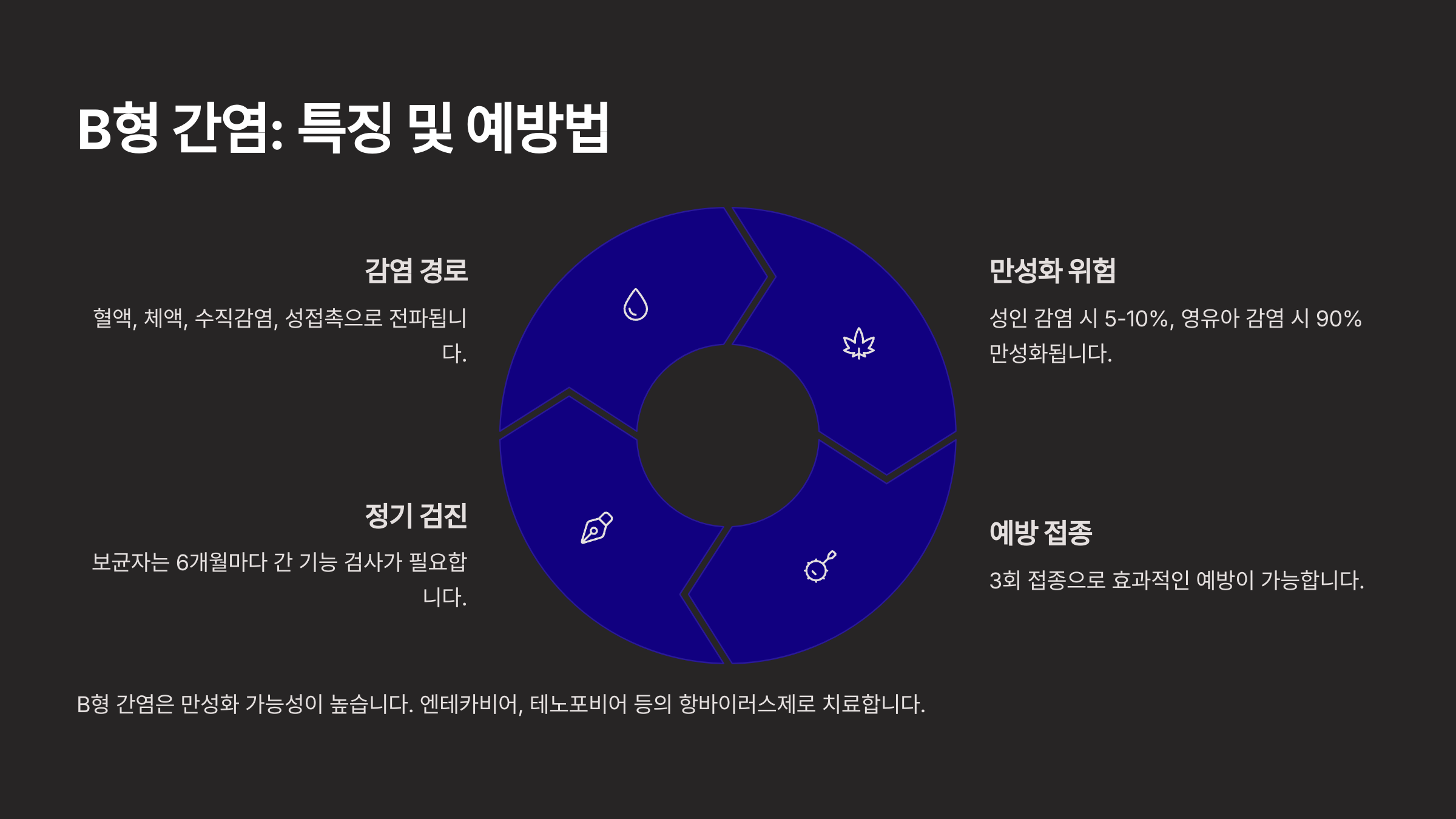 B형 간염은 전 세계적으로 가장 널리 퍼져 있는 간염 중 하나예요. 특히 우리나라와 아시아권에서 보균율이 높은 질병이에요. B형 간염은 B형 간염 바이러스(HBV)에 의해 발생하며, 혈액이나 체액을 통해 전염돼요. 감염되면 급성 간염으로 시작되지만, 일부는 만성화되어 간경변이나 간암으로 발전할 수 있어요.