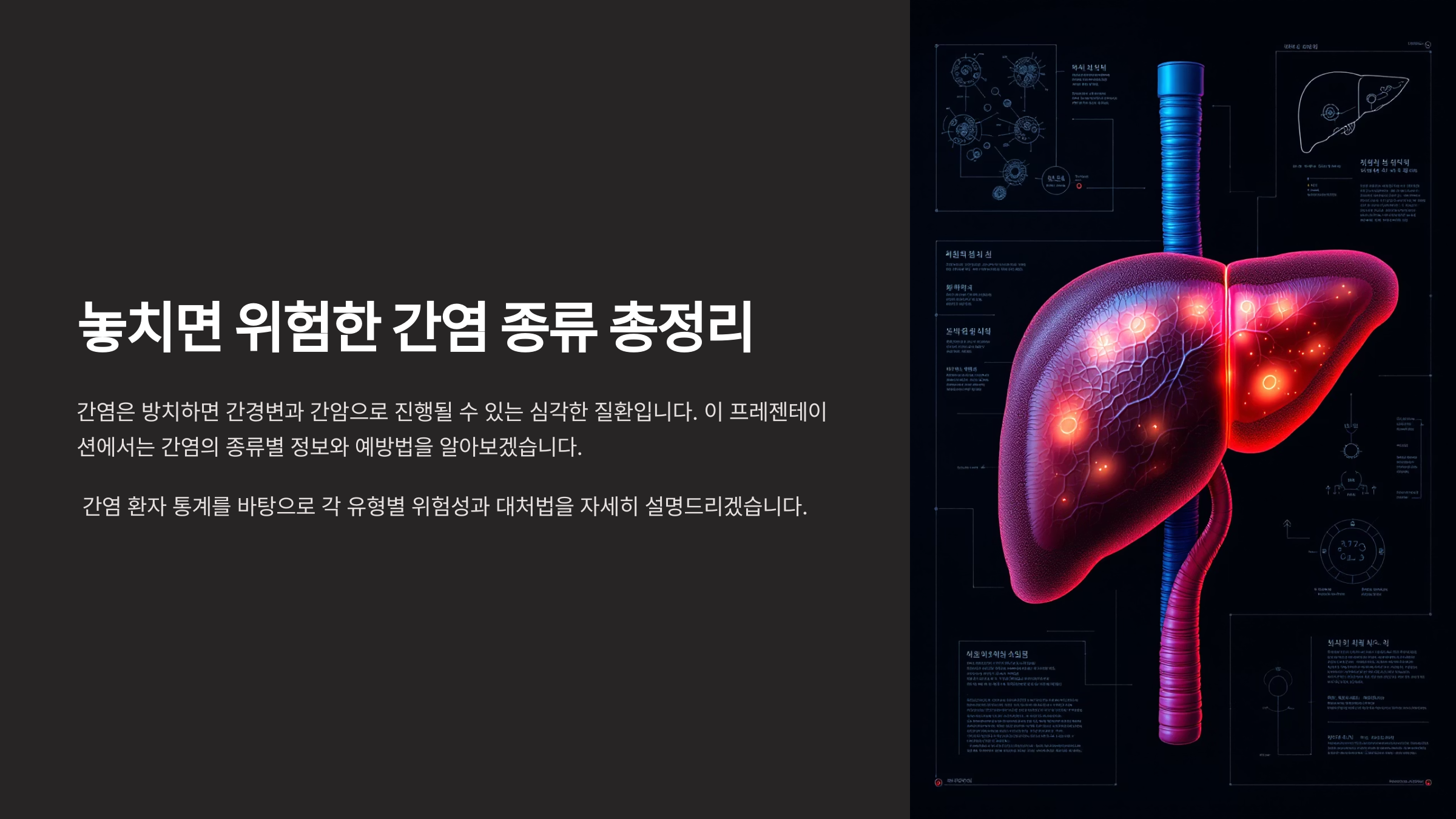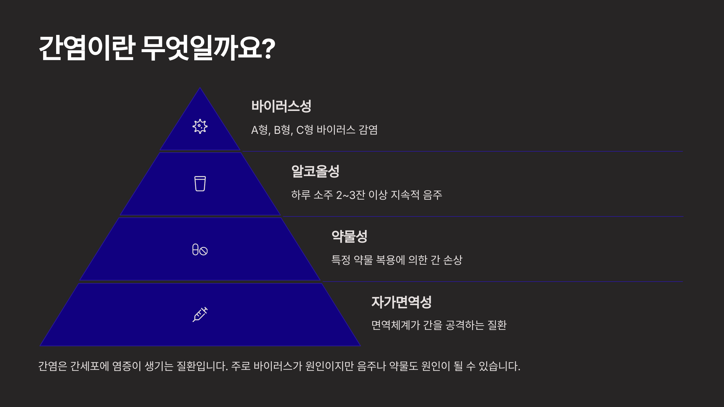 간염은 간에 염증이 생기는 질환이에요. 바이러스 감염이 가장 흔한 원인이지만, 알코올, 독성 물질, 약물 부작용 등도 원인이 될 수 있어요. 전 세계적으로 수억 명이 감염되어 있으며, 일부는 만성 간염으로 진행되어 간경변이나 간암으로 이어질 수 있답니다.