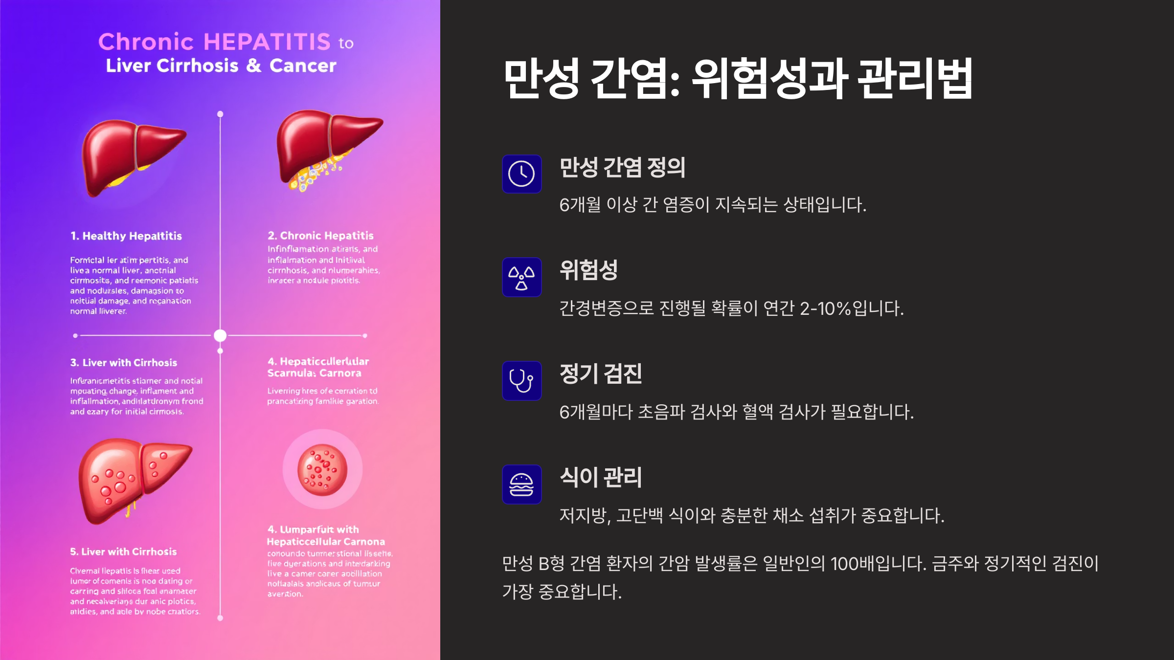 만성 간염이 무서운 이유는 바로 '조용한 진행'이에요. 겉으로는 아무 이상 없어 보여도 간세포가 서서히 파괴되면서 간경화, 간부전, 간암 같은 심각한 질병으로 발전할 수 있거든요. 그래서 정기적인 검진과 꾸준한 치료가 필수예요.