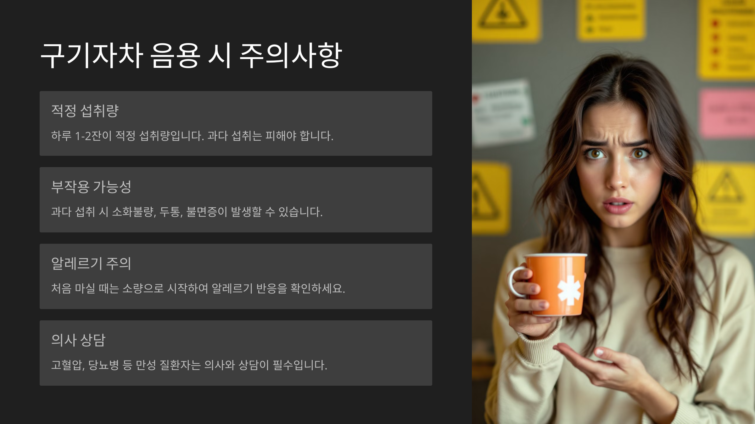 구기자차는 대부분의 사람들에게 안전한 천연차지만, 체질에 따라 주의가 필요한 경우도 있어요. 대표적으로 열이 많은 체질이나 알레르기가 있는 경우, 구기자가 몸에 맞지 않아 두통, 복통, 피부 트러블 등의 반응이 나타날 수 있어요.