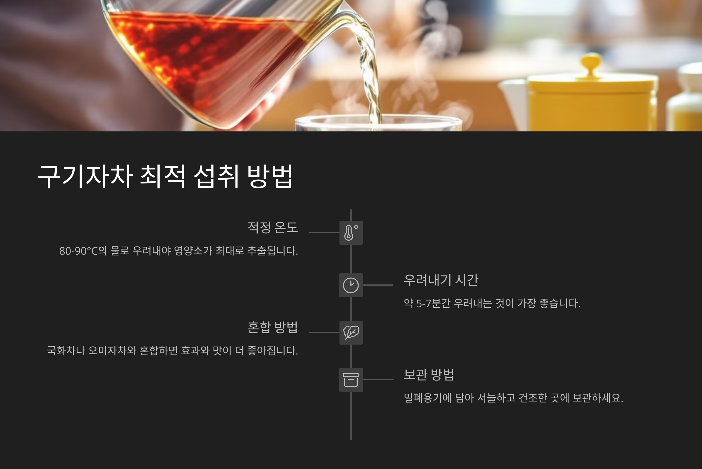 구기자차는 또한 항염 작용이 있어 눈의 염증을 줄여줄 수 있고, 안구건조증 완화에도 도움을 줘요. 현대인의 만성적인 눈 피로, 뻑뻑함, 침침함 등의 증상을 자연스럽게 관리할 수 있는 데일리 건강차로 주목받고 있죠.