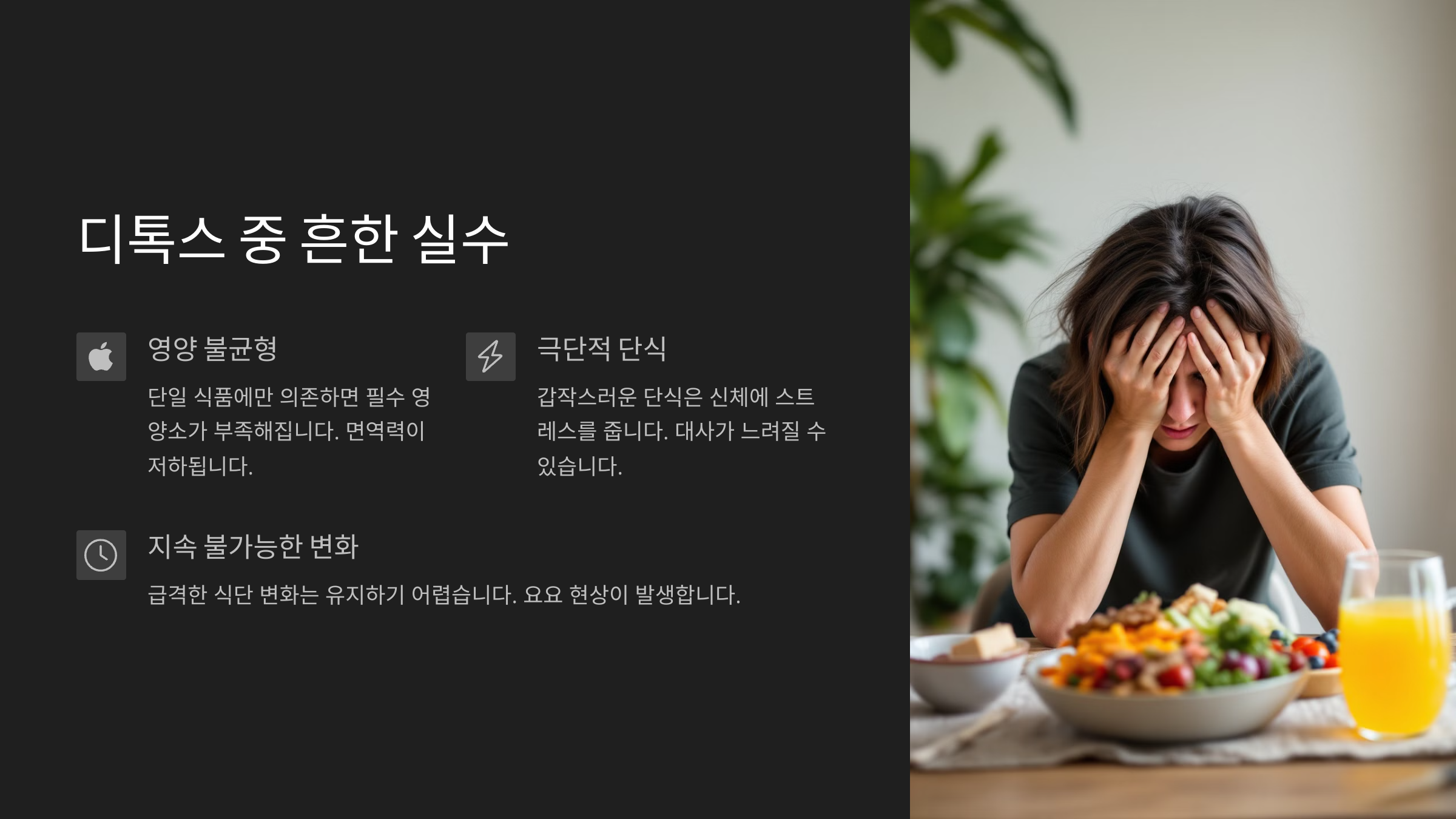 또 다른 실수는 ‘계획 없이 시작하는 것’이에요. 영양 지식 없이 유행만 따라 무작정 디톡스를 시작하면, 우리 몸이 원하지 않는 상태에 놓이게 돼요. 특히 혈당이 급격하게 떨어지거나 변비가 생기는 경우도 많고, 그로 인해 식욕 폭발로 이어지는 경우가 흔해요.