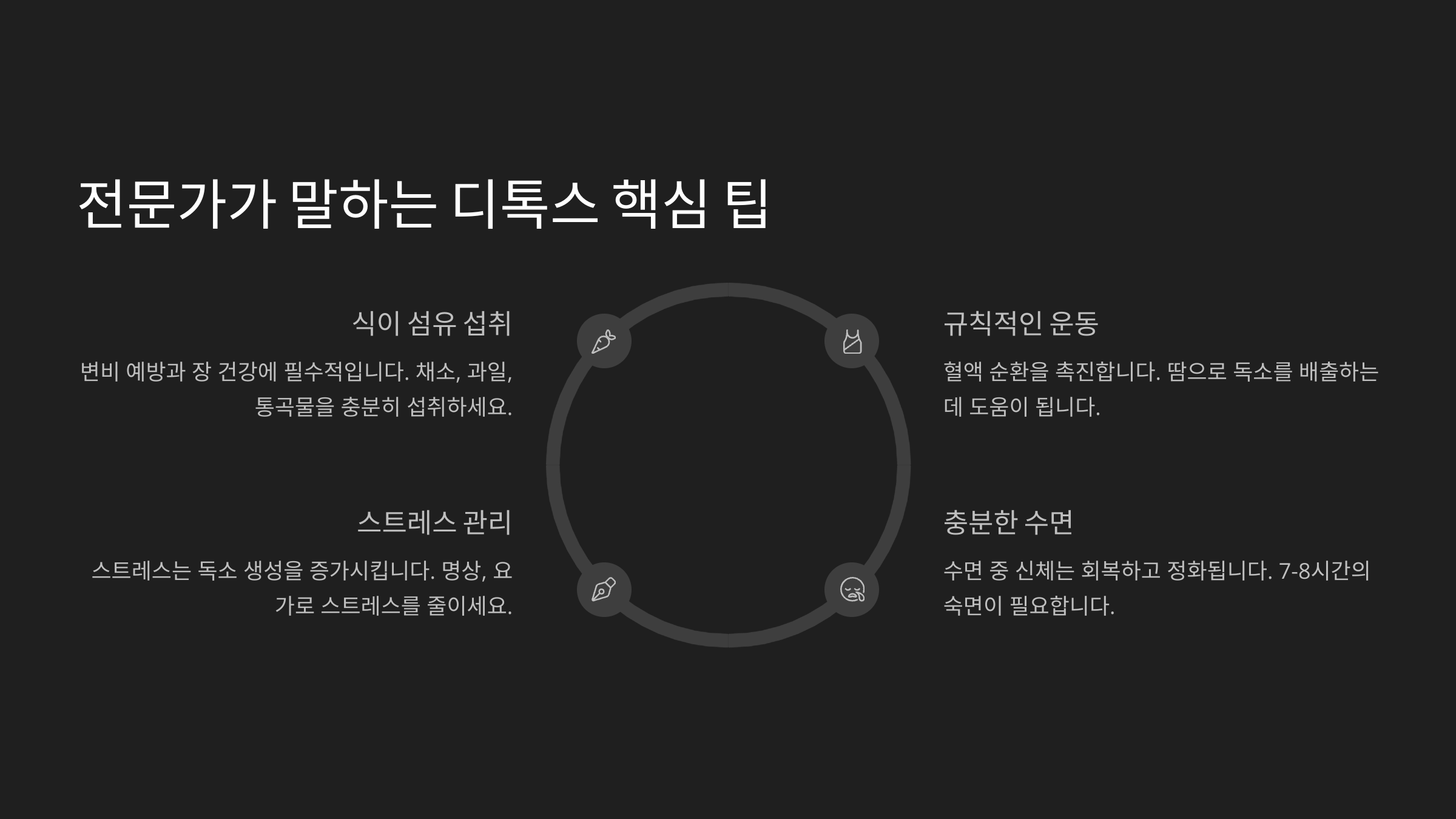 전문가들은 수면의 중요성도 항상 강조해요. 숙면은 신체 해독 작용이 가장 활발하게 이뤄지는 시간이에요. 밤 11시 이전에 자는 습관, 최소 7시간의 숙면은 간 건강에도 도움이 되고, 신진대사도 활발하게 돌아가요. 디톡스는 ‘자는 동안’ 더 강해진다는 걸 기억해요!