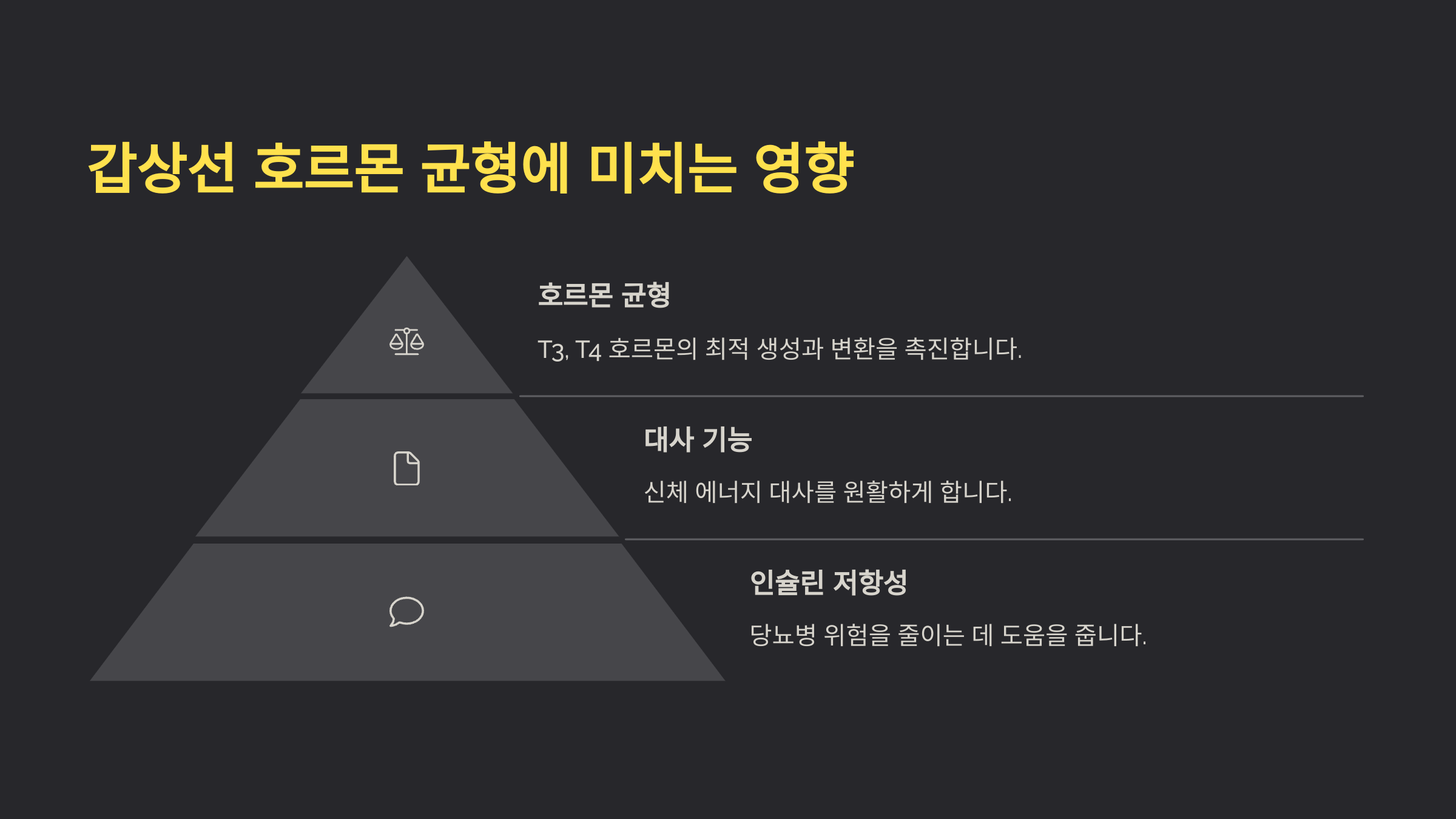 갑상선 호르몬인 T3와 T4는 대사를 조절하고 체온, 심장박동, 소화까지 다양한 기능을 담당하고 있어요. 이 호르몬이 균형을 이루려면 셀레늄이 꼭 필요해요.