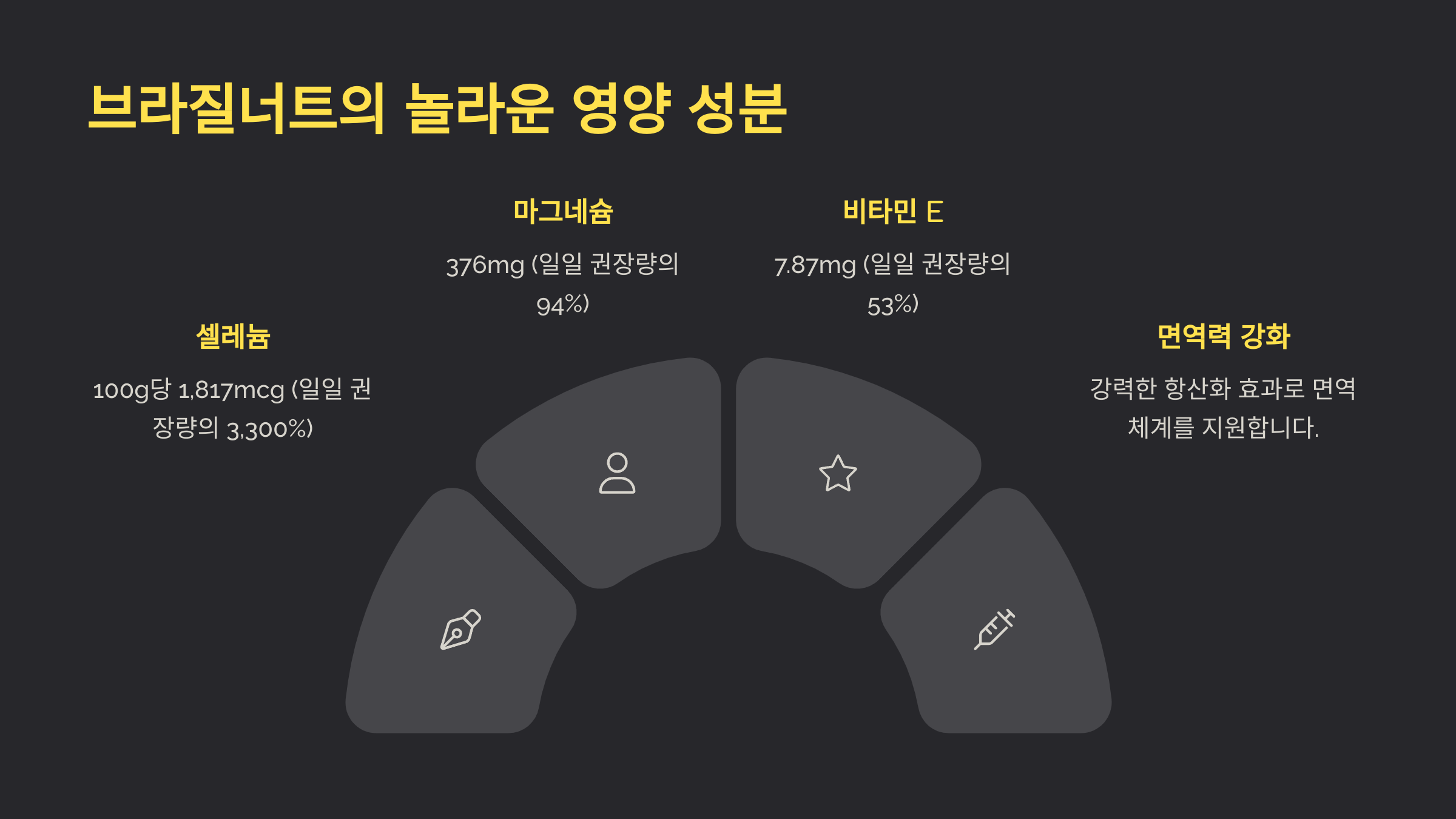 특히 브라질너트 한 알에는 무려 60~90mcg 이상의 셀레늄이 들어있는데요, 이는 성인 권장 섭취량(약 55mcg)을 단 한 알로도 초과할 수 있다는 뜻이에요.