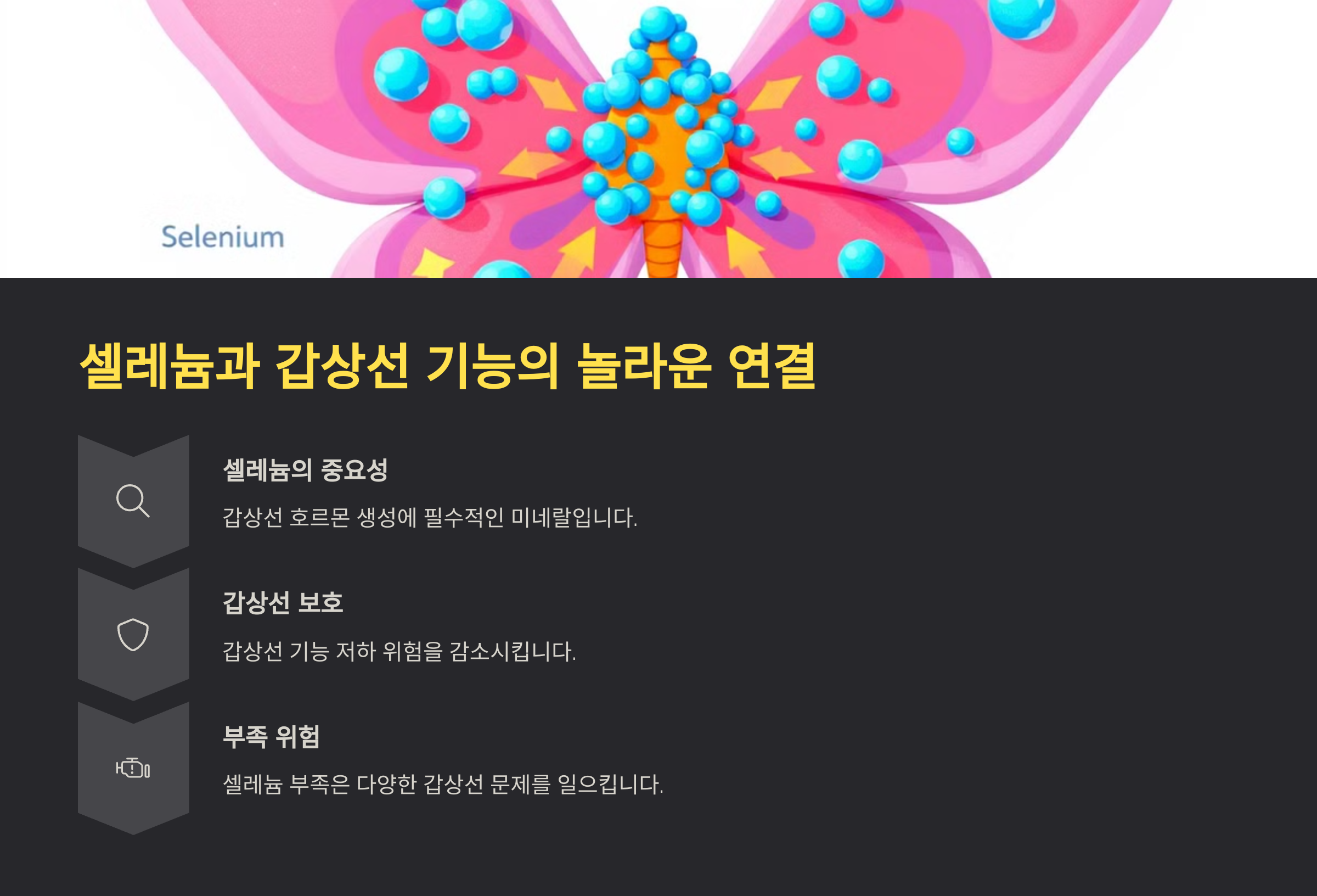 바로 이때 필요한 영양소가 셀레늄이에요. 갑상선 기능이 떨어질 때 셀레늄 수치도 함께 낮아지는 경우가 많기 때문이죠.