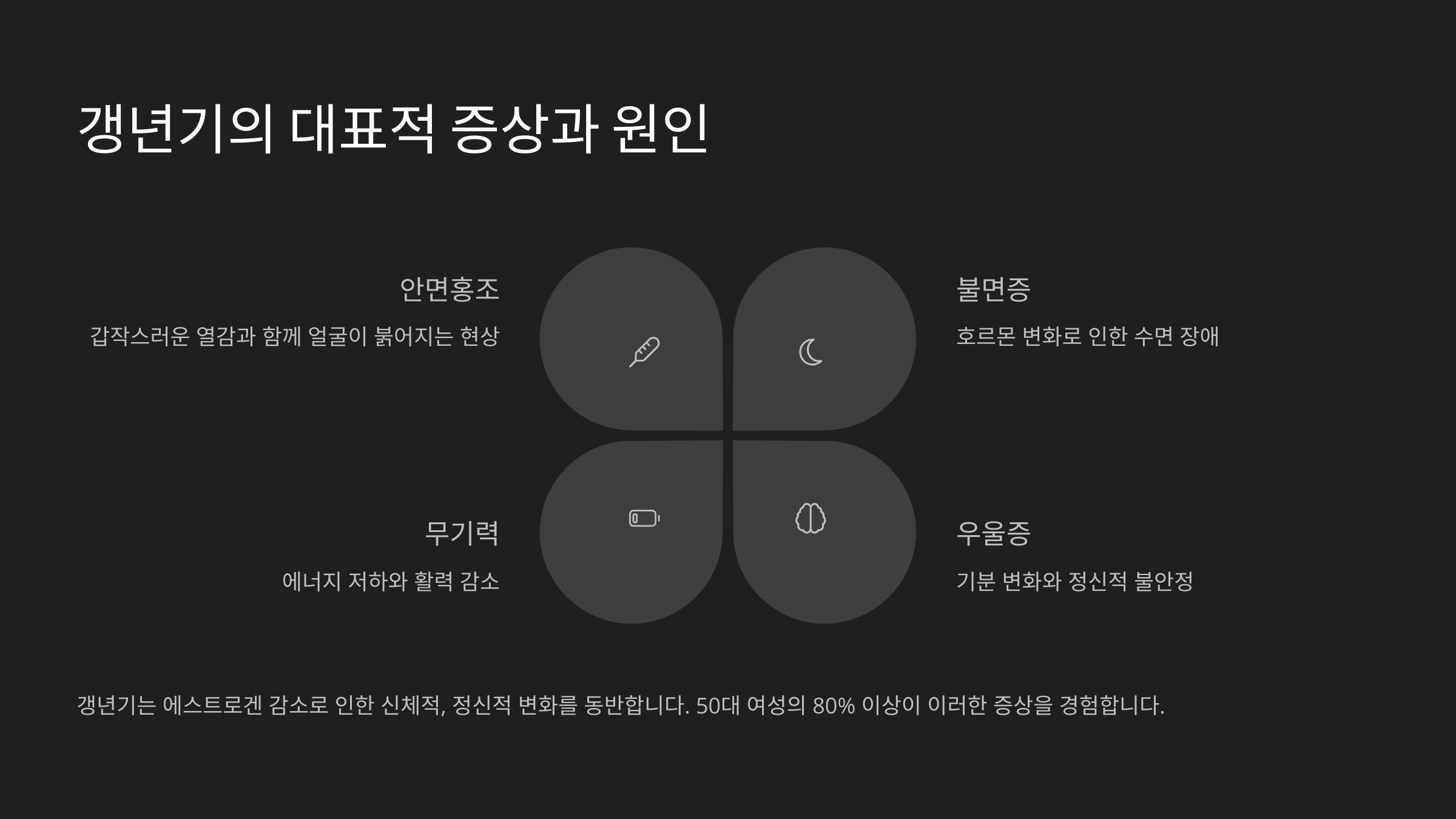 갱년기는 단지 '여성만의 변화'가 아니라, 삶의 리듬 전체를 바꾸는 시기예요. 신체적 증상뿐 아니라 정서적, 심리적인 영향을 함께 받아요. 그래서 이 시기를 이해하는 게, 그 어떤 건강관리보다 중요하다고 느껴져요.