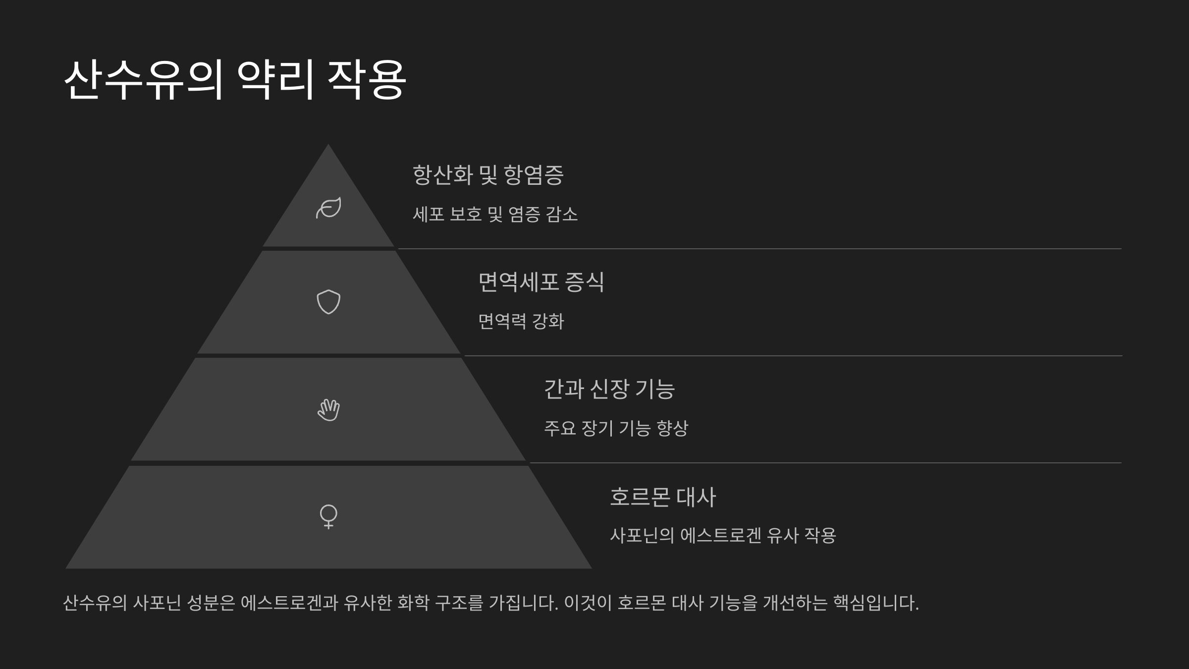 이처럼 산수유의 약리작용은 단순히 '몸에 좋다'는 수준을 넘어, 의학적 작용 메커니즘으로도 설명 가능한 부분들이 꽤 많아요. 갱년기 여성의 삶의 질을 높이는 데에 실질적인 도움을 줄 수 있는 이유가 바로 여기에 있어요.