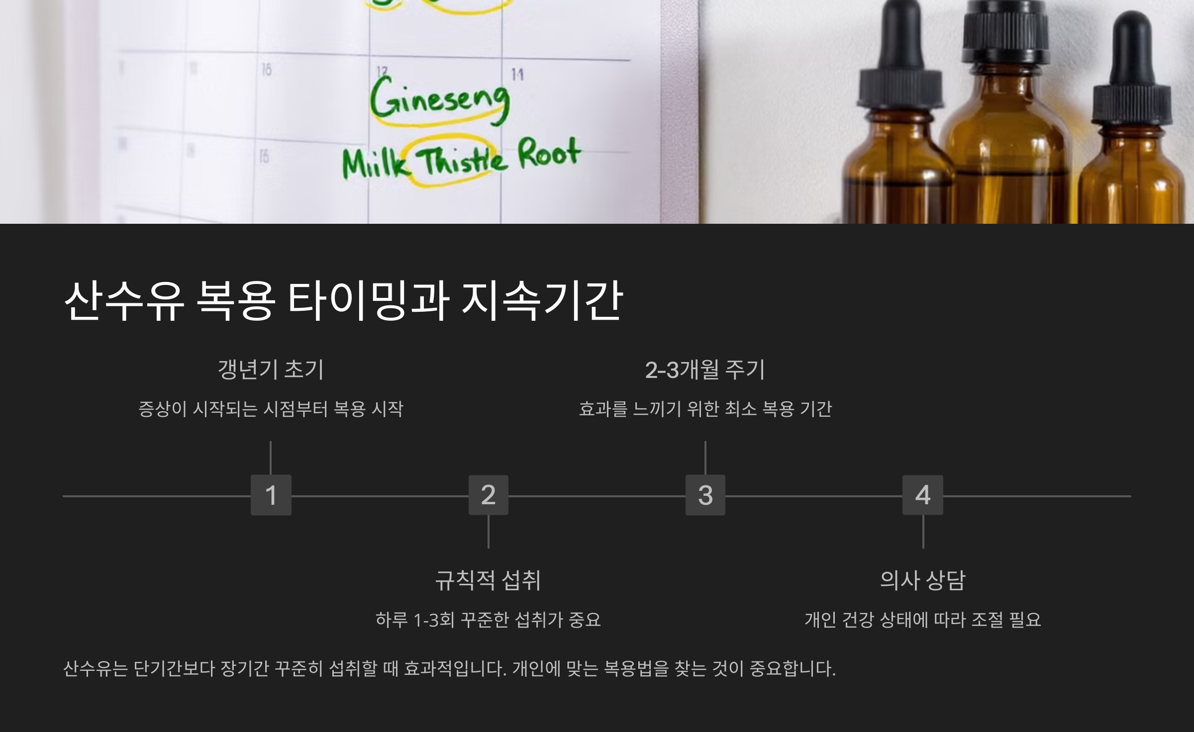 단, 3개월 이상 장기 복용 시엔 중간에 1~2주간 섭취를 멈추는 '휴지기'를 두는 것이 좋아요. 이는 간과 위장의 부담을 줄이고, 장기적으로 더 효과적인 복용 습관을 형성하는 데 도움이 돼요. 특히 산수유는 장기 복용 시 수렴 작용이 강해질 수 있으니 주기적인 관리가 필요해요.