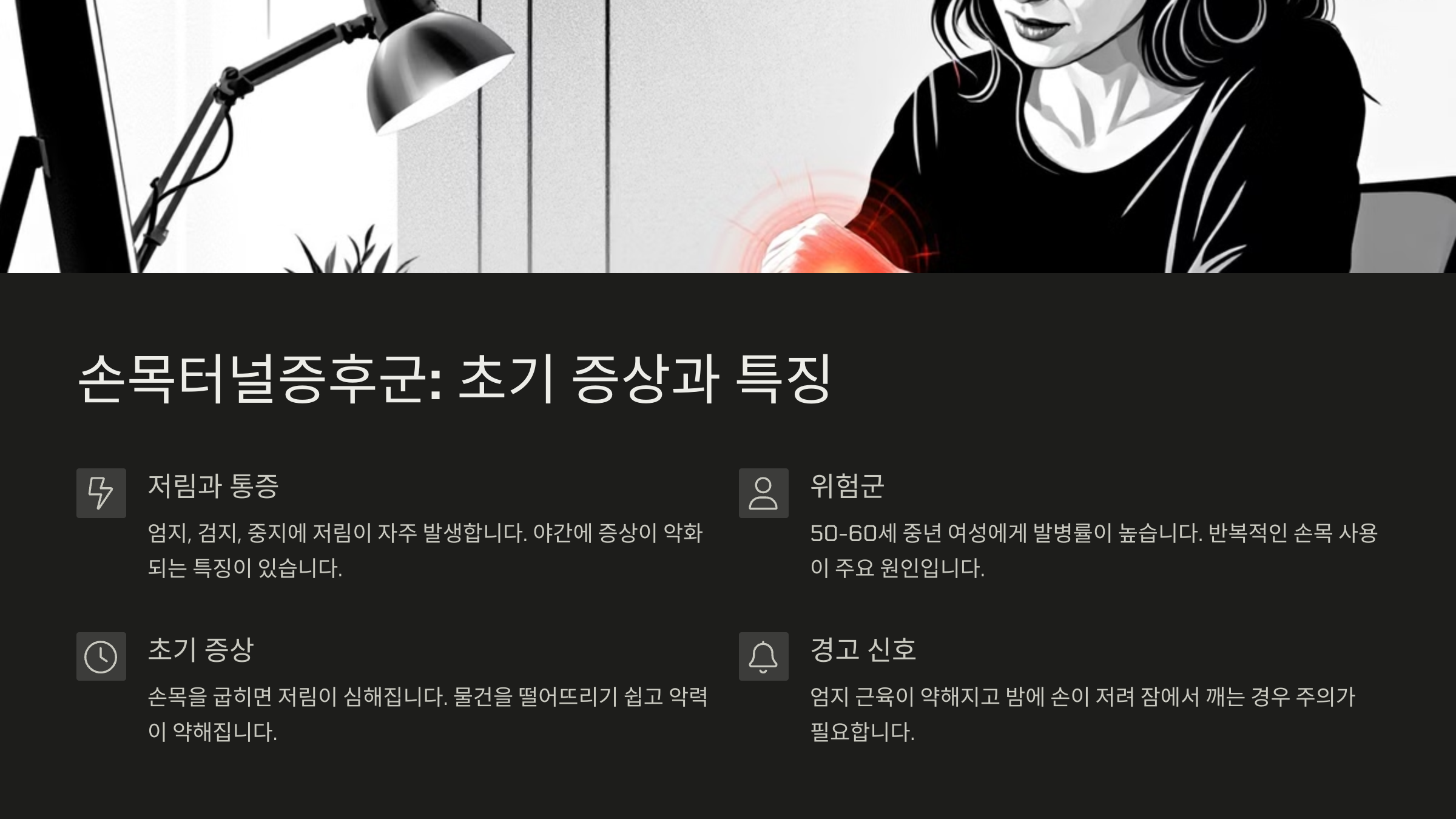 예를 들어, 손목터널증후군의 경우 가장 흔한 증상은 엄지~약지 사이의 저림이에요. 특히 밤에 증상이 심해지거나, 아침에 손이 뻣뻣하고 저린다면 이 질환을 의심해볼 수 있어요.