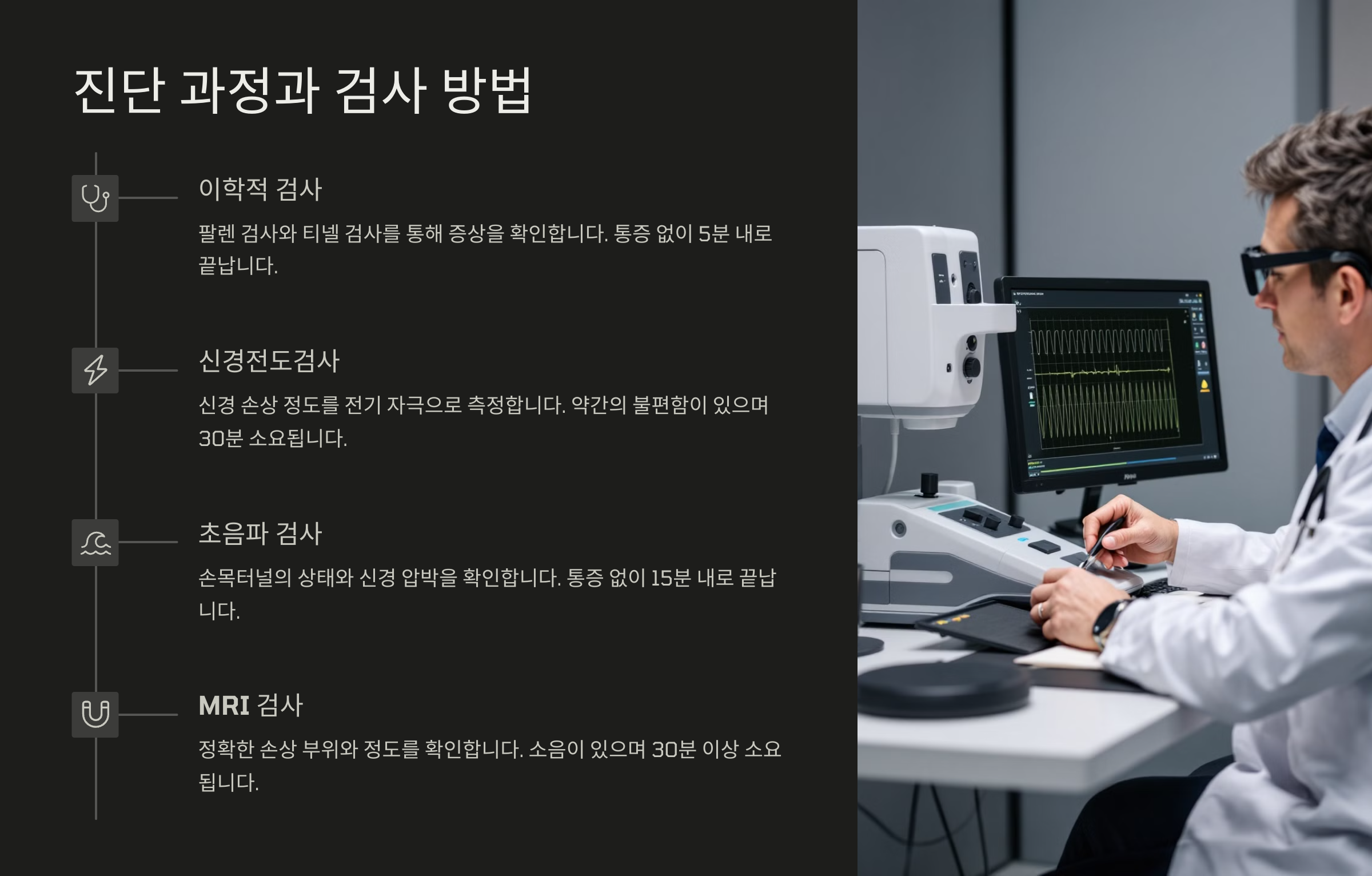 특히 손목터널증후군을 확진하기 위해선 **신경전도 검사**가 중요하고, TFCC 손상은 **MRI**를 통해 연골 구조를 확인해야 해요. 단순 촉진 검사만으로는 진단이 어려운 경우가 많거든요.