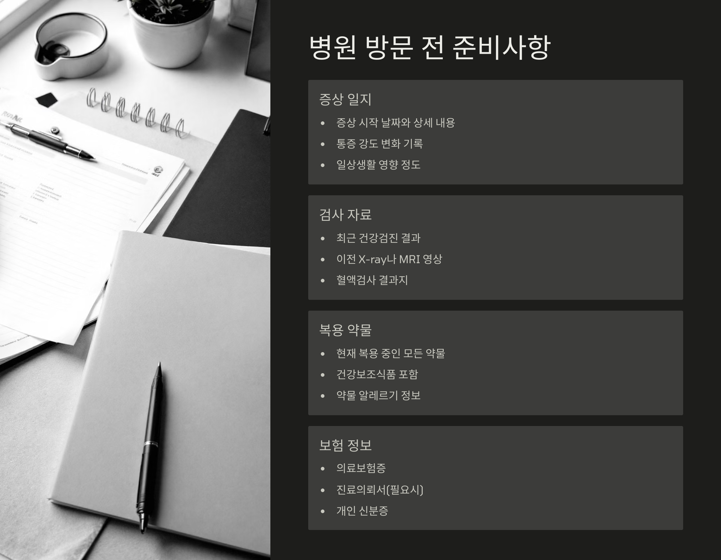 세 번째는 **기존 복용 중인 약**이에요. 손목 통증과 직접 연관이 없어 보이더라도, 모든 약물을 미리 리스트로 작성해오면 약물 부작용이나 상호작용도 고려할 수 있어요.