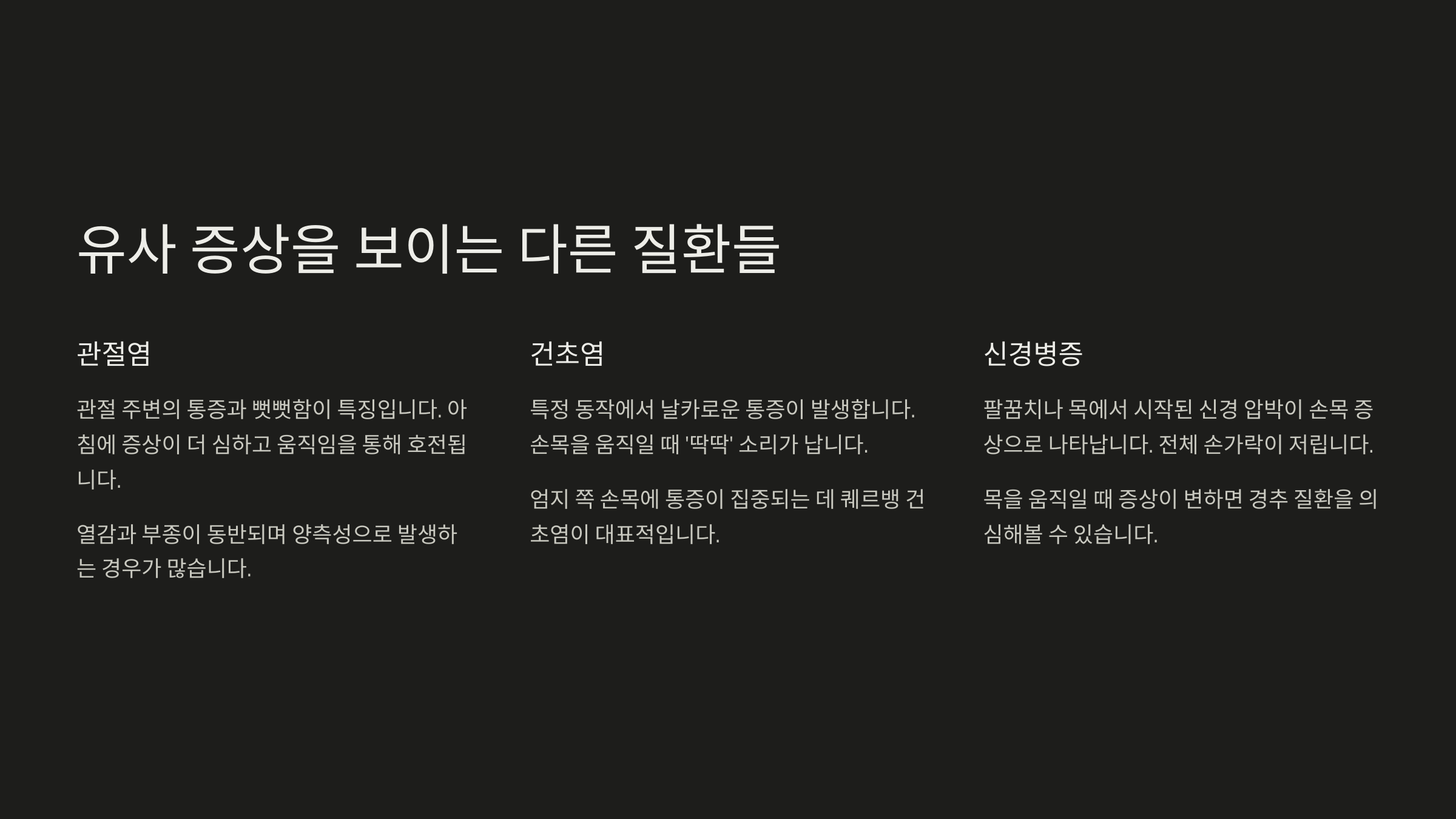 | 손목터널증후군 | 저림, 찌릿함, 야간 악화 | 손목 신경 압박 |
