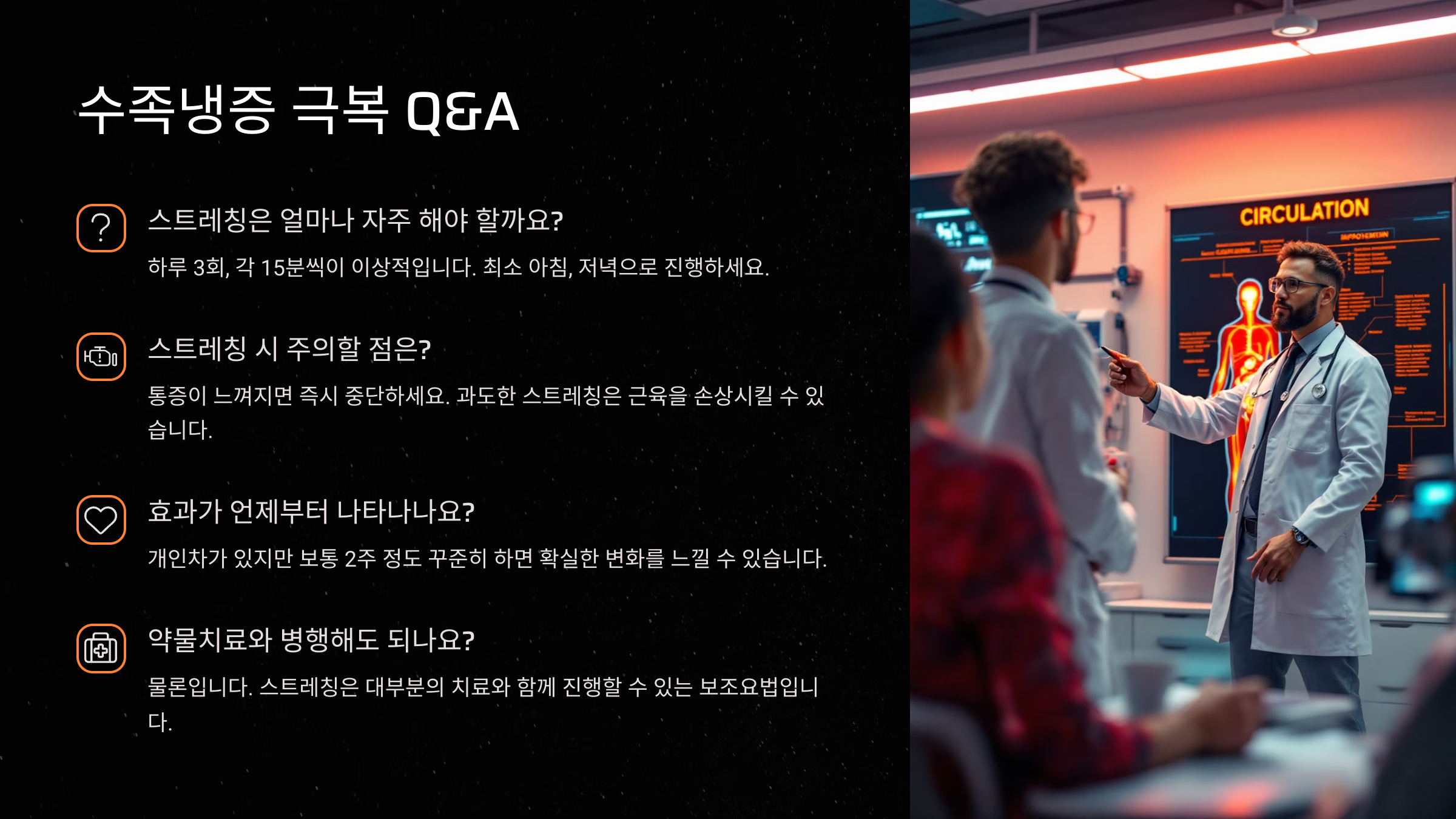 A4. 일시적으로 따뜻해졌더라도, 혈류 순환이 지속적으로 원활하지 않으면 금방 식어요. 스트레칭으로 순환을 유지해주는 것이 핵심이에요.