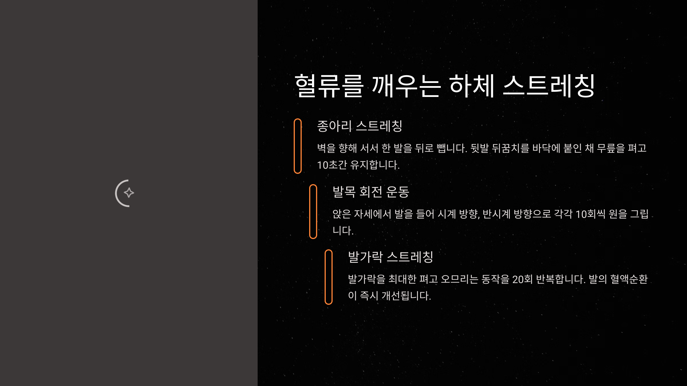| 발목 돌리기 | 앉은 채로 발목을 크게 회전 | 30초 |