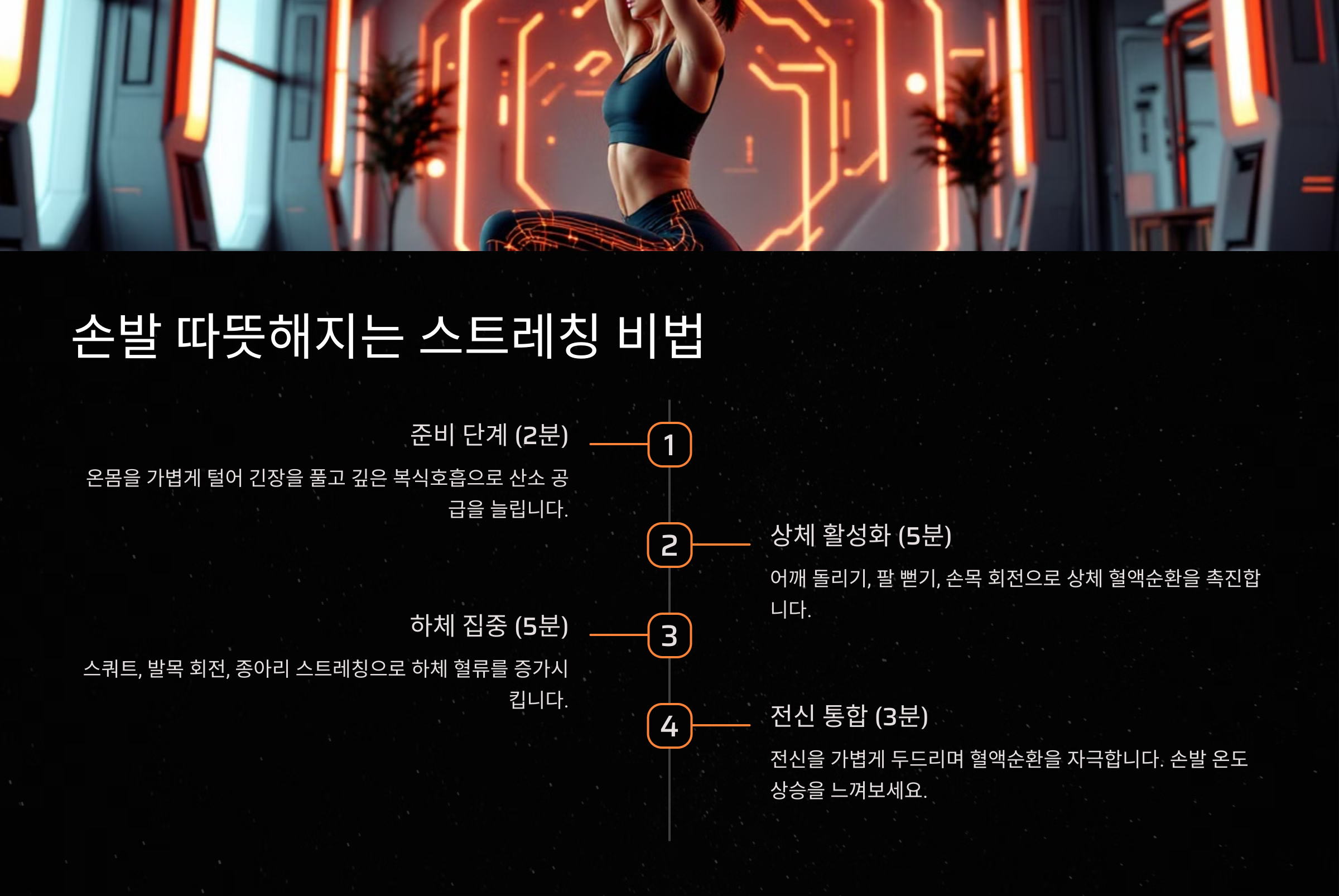 이제 실제로 손발이 따뜻해질 수 있는 '루틴 스트레칭'을 알려드릴게요! 이 루틴은 10분 이내로 완성할 수 있고, 혈액 순환에 효과적인 동작들을 순서대로 조합해 만들었어요. 아침, 저녁 또는 추울 때마다 활용하면 손발 차가움이 많이 줄어들 거예요.