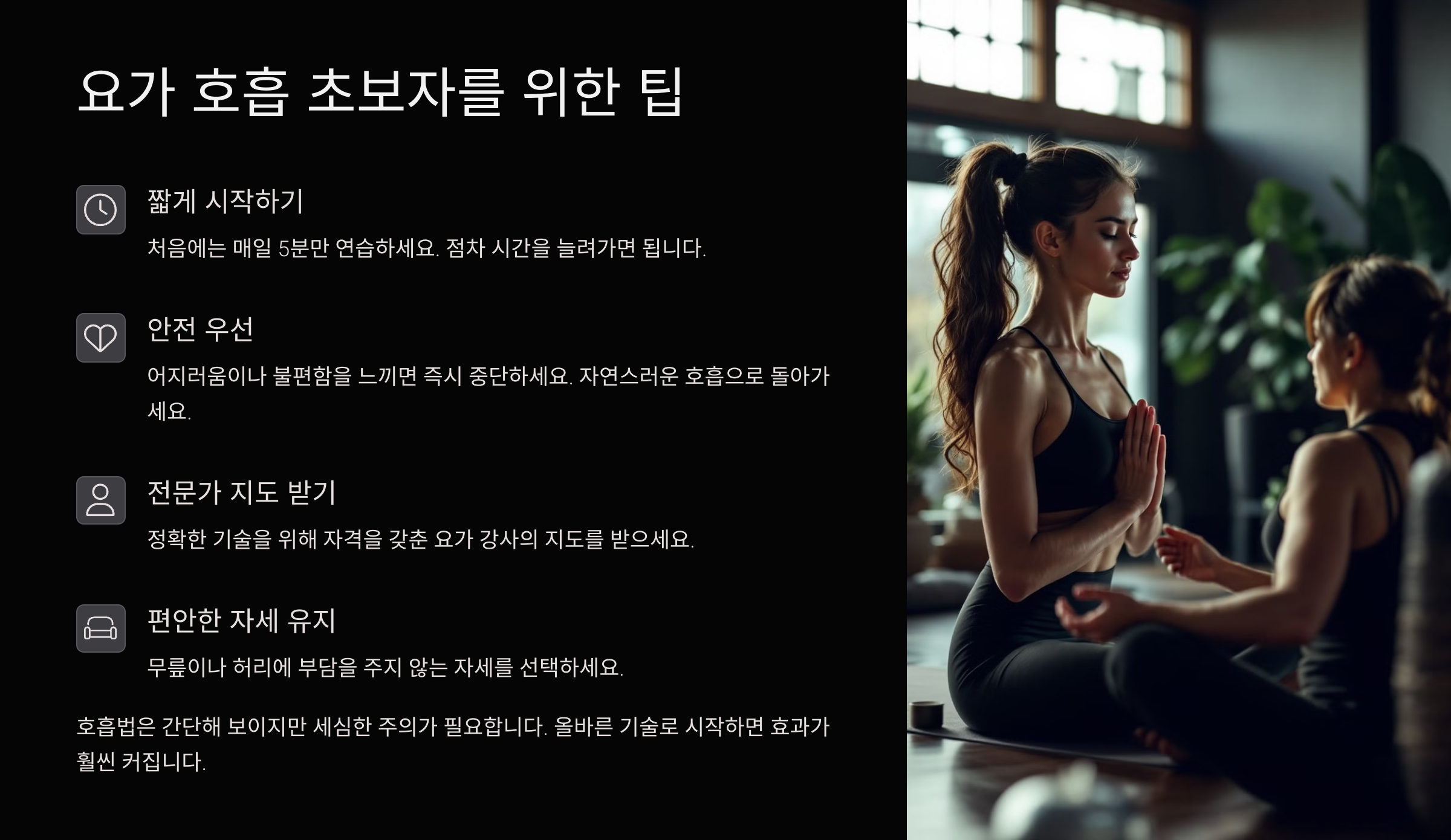 내가 생각했을 때 요가 호흡의 진짜 매력은 아주 작은 변화에서 시작된다는 거예요. 하루 5분만 제대로 된 호흡을 해도 마음이 한결 가벼워지더라고요. 💆♀️