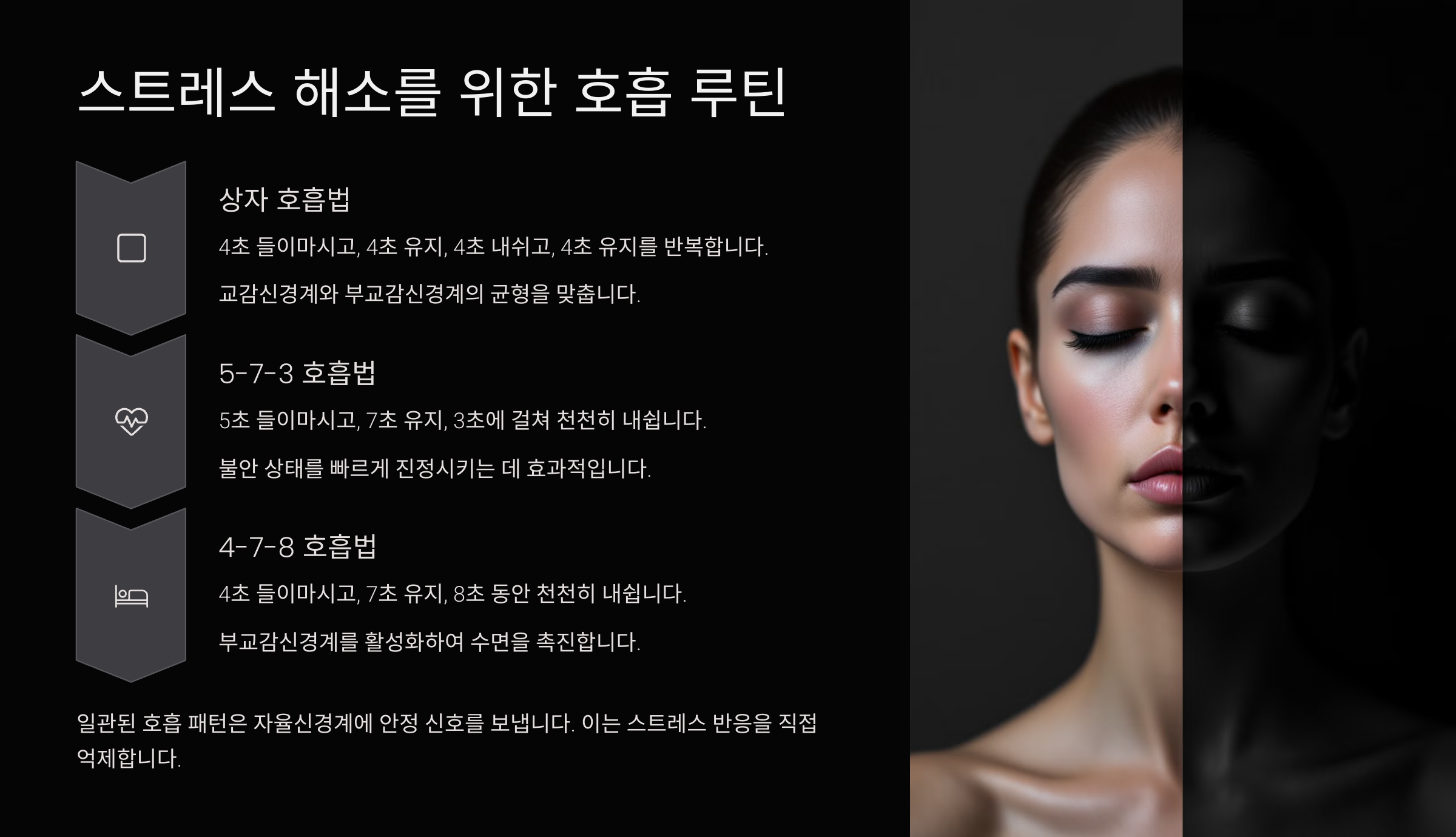 | 4-7-8 호흡 | 4초 들숨, 7초 정지, 8초 날숨 | 신경 안정 |