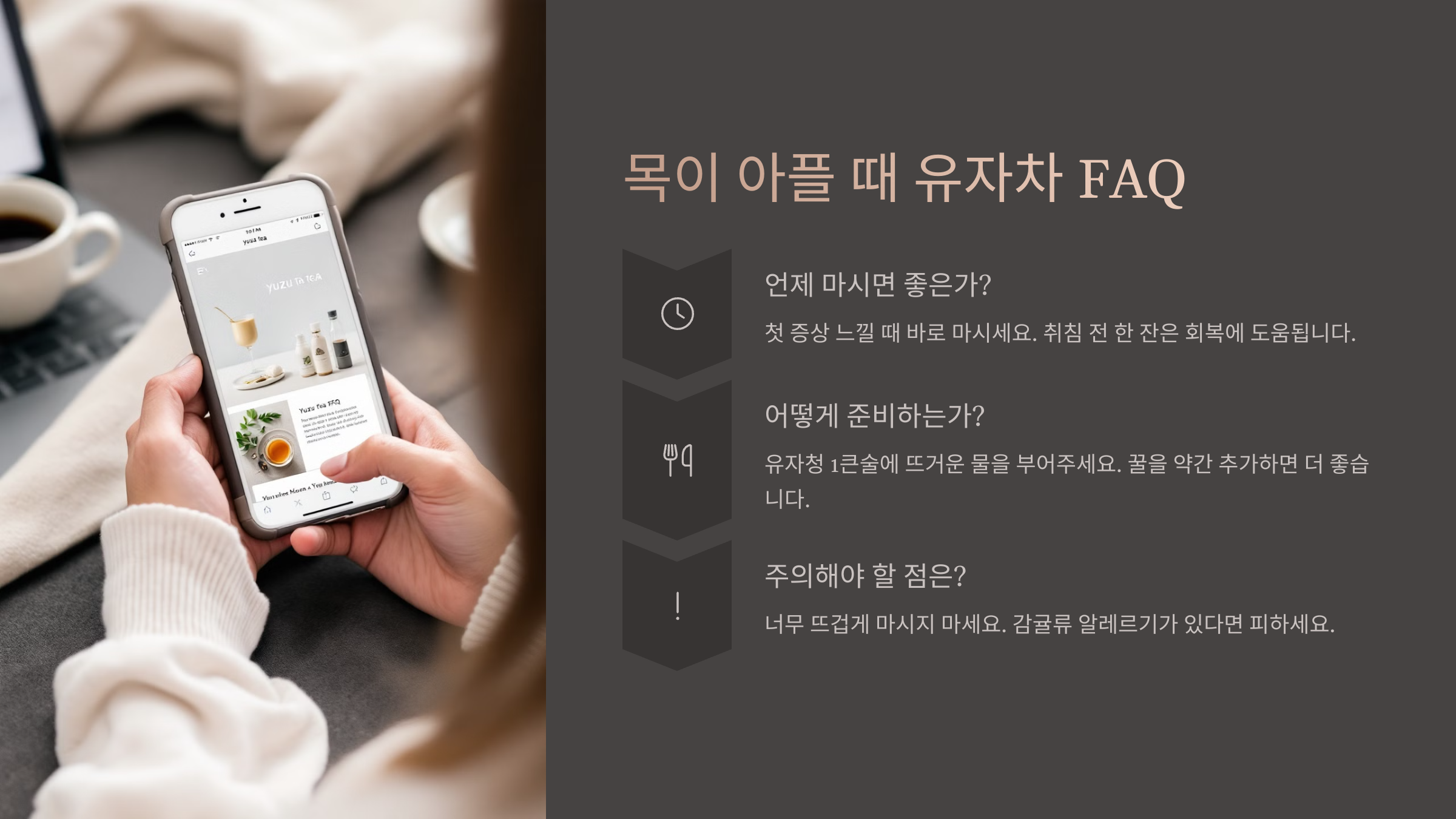 차를 너무 뜨겁게 마시는 것도 목에 오히려 자극이 될 수 있어서, 따뜻하지만 적당한 온도로 마시는 것이 중요해요. 하루 중 아침에 한 잔, 저녁에 한 잔 마시는 습관을 들이면 목 건강을 꾸준히 관리할 수 있어요. 유자차도 결국 꾸준함이 관건이에요! 🍵