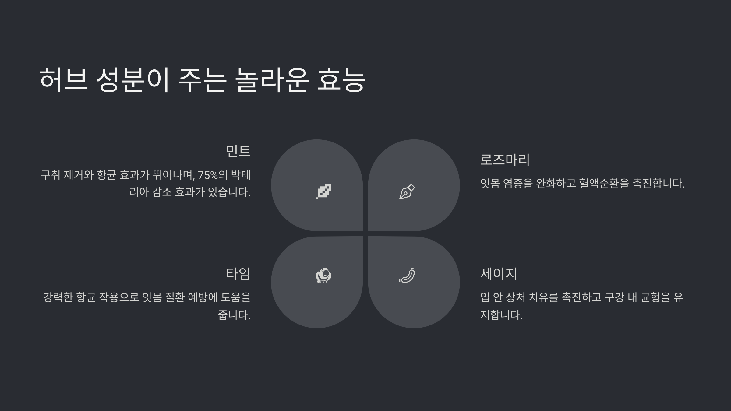 | 로즈마리 | 혈액순환 촉진, 항산화 | 전반적인 구강 건강 유지 |