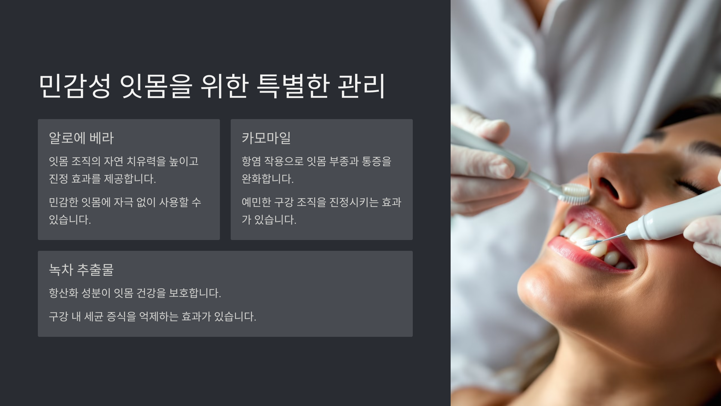 | 세이지 | 항염, 진정 효과 | 민감 잇몸 사용자 |
