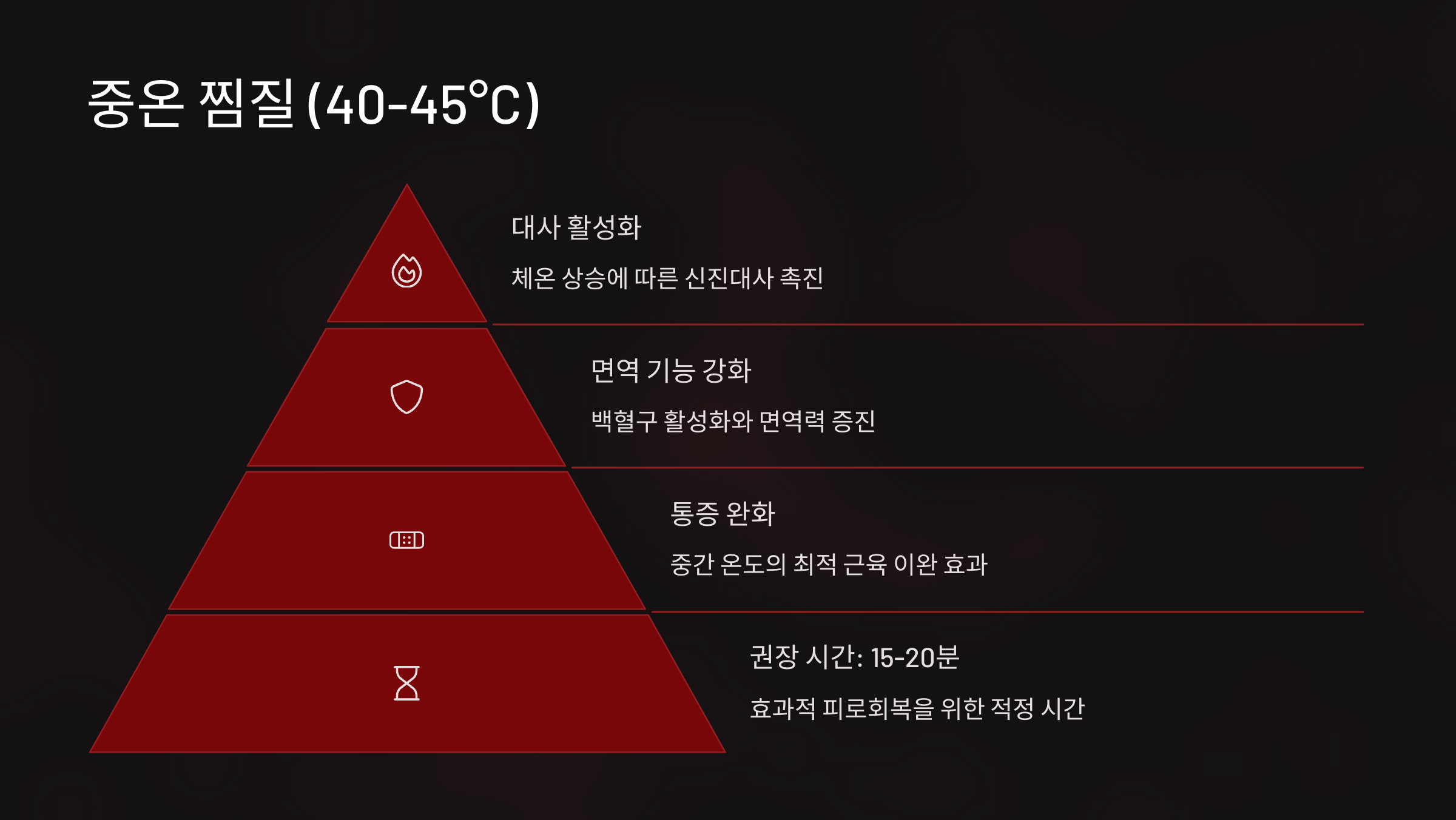 | 중온 (46~60℃) | 15~20분 | 피로 회복, 근육 이완 |