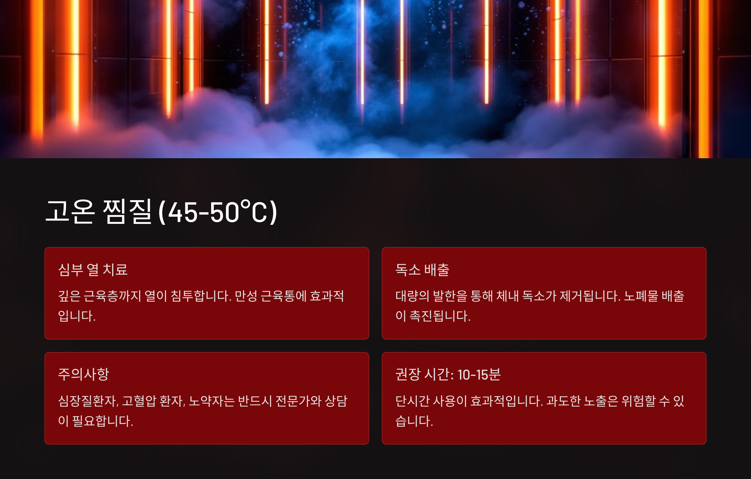 | 고온 (61℃ 이상) | 땀 배출, 해독 작용 | 탈수, 심장 부담 |